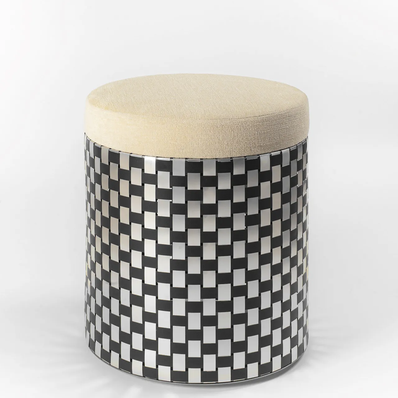 Ispirato al movimento Optical Art degli anni ’60, questo splendido pouf sfoggia un design visivamente accattivante e scintillante, realizzato intrecciando doghe di alluminio nero e naturale riciclate da rifiuti industriali, una tecnica nota come Splot. Con una classica silhouette cilindrica completata da un raffinato cuscino beige, sarà un’aggiunta calda e sofisticata a un interno moderno.