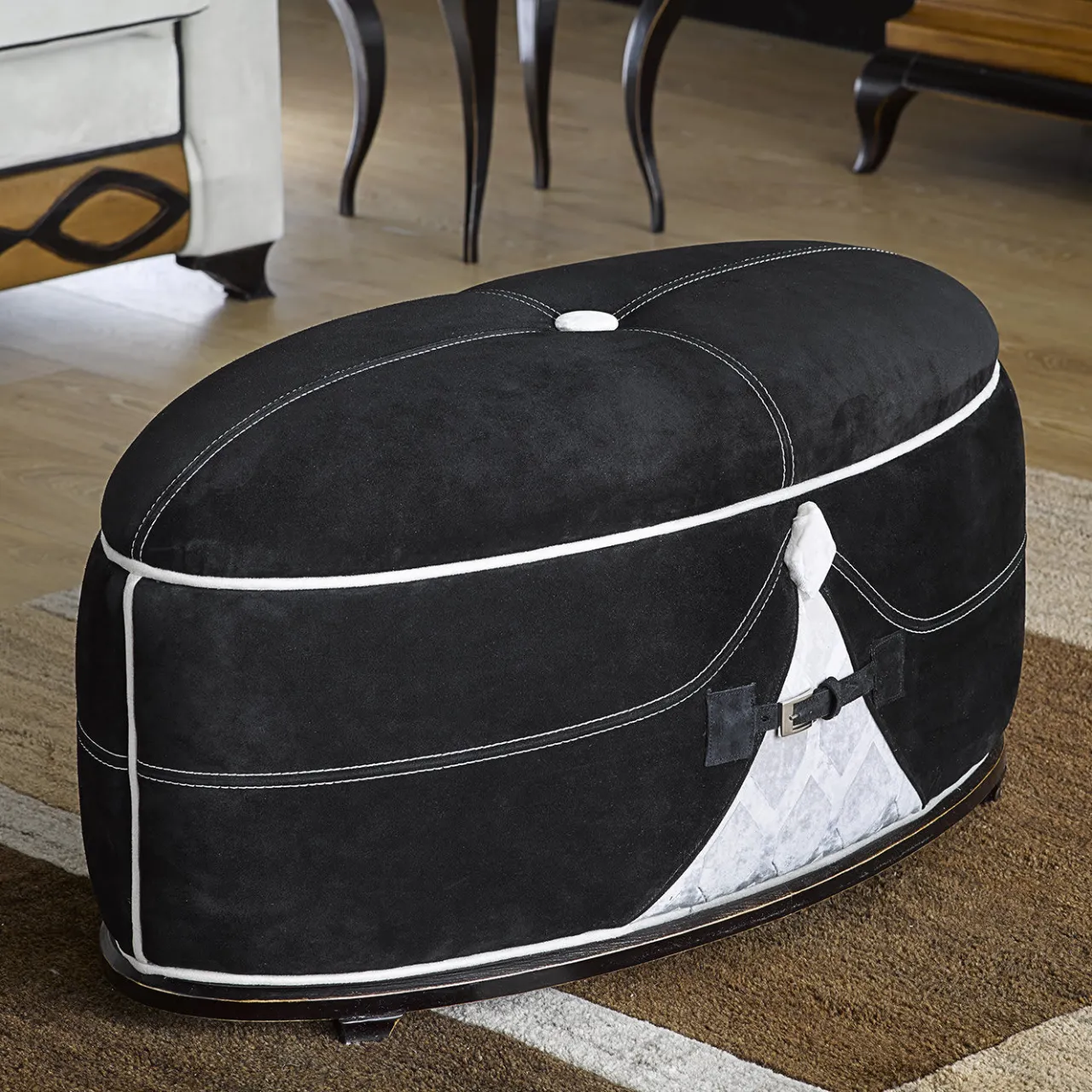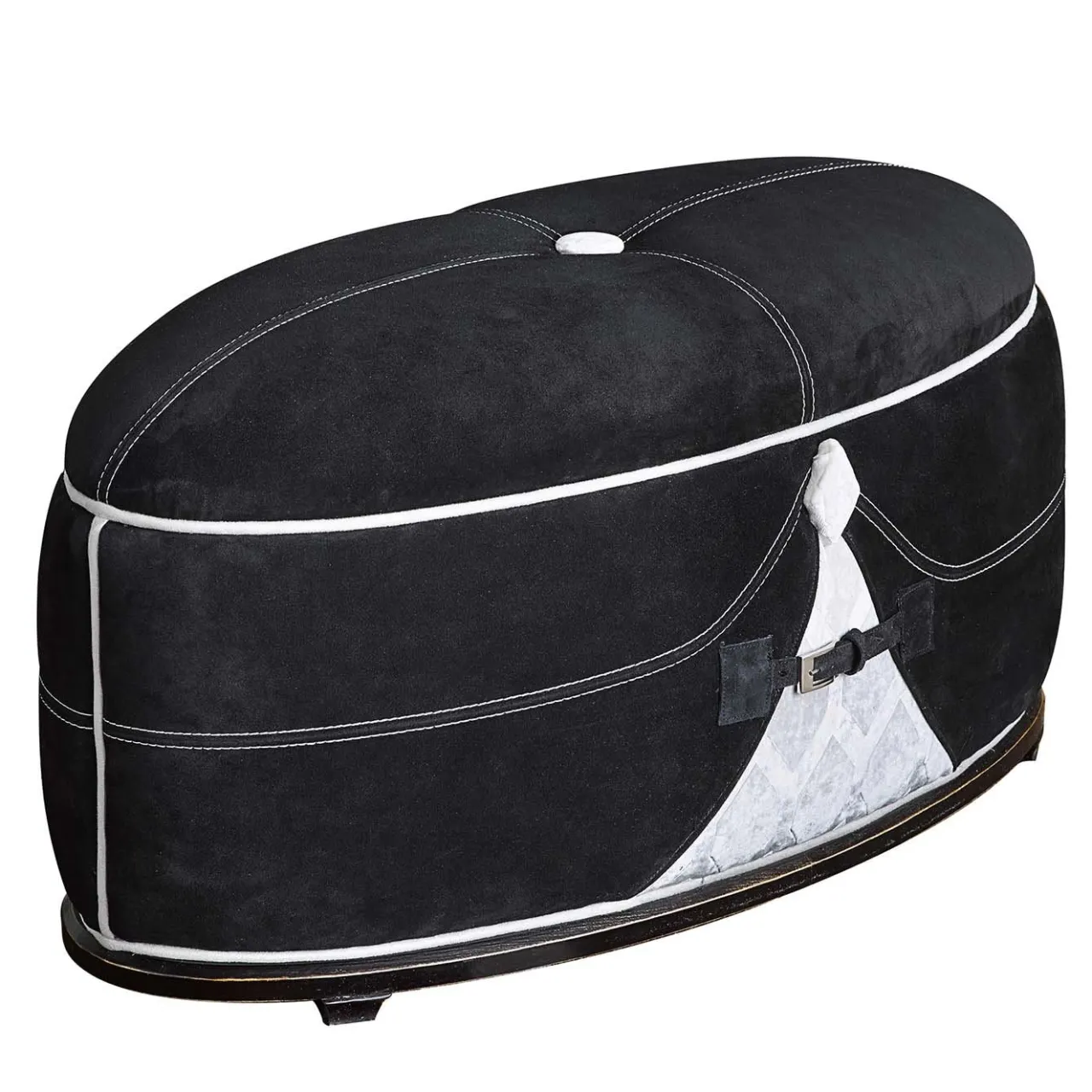Dopo una lunga giornata, appoggiate le gambe su questo elegante pouf ovale. Questo pezzo è in pelle nera e presenta profili bianchi a contrasto sui lati, un bottone bianco sulla parte superiore e un’apertura bianca lungo il lato della parte anteriore, quasi a ricordare la cravatta di uno smoking, per una dichiarazione elegante e di classe in qualsiasi spazio abitativo.