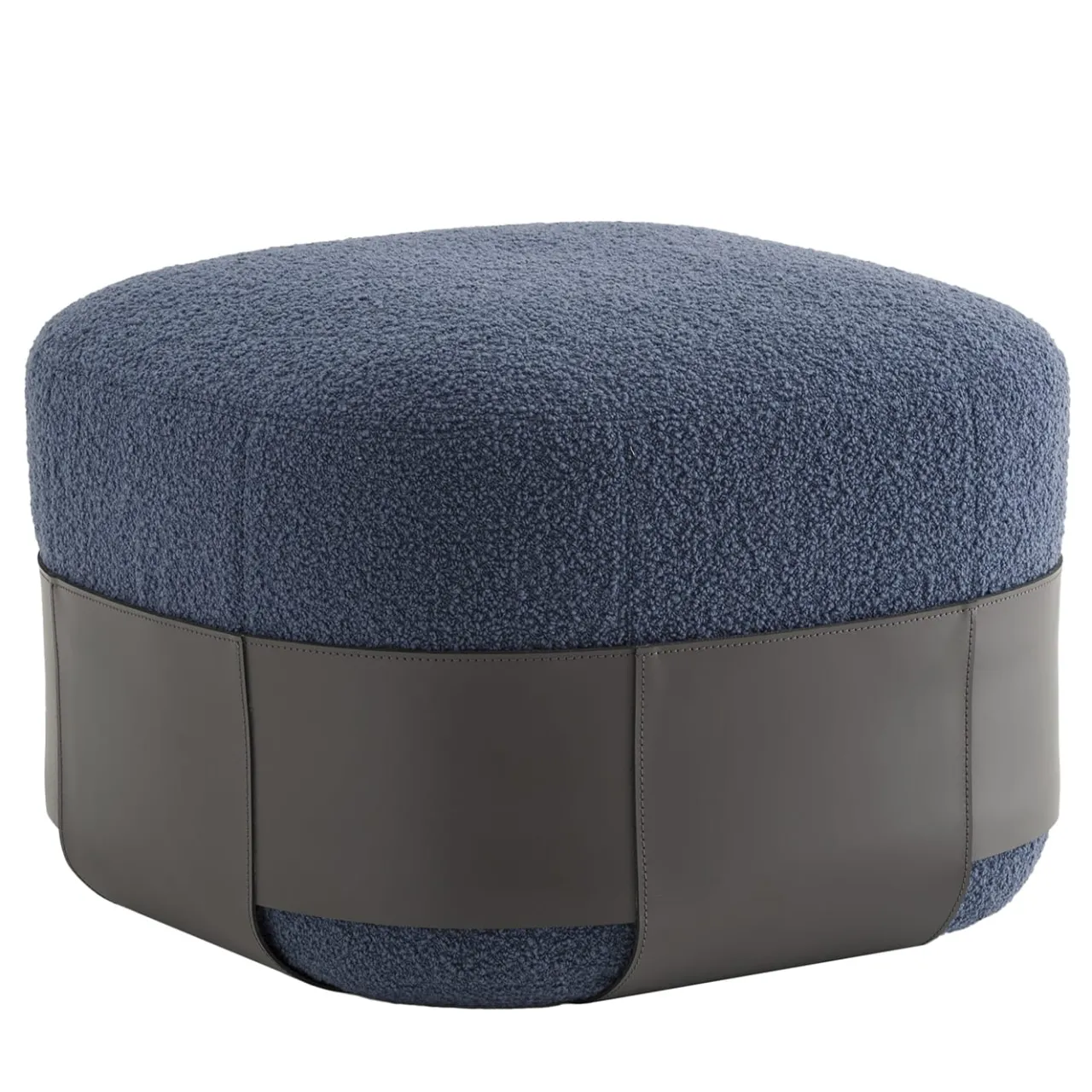 Ispirato in modo giocoso ai lottatori di sumo, questo pouf offre una soluzione di seduta morbida, perfetta quando arriva un ospite inatteso o come poggiapiedi dopo una lunga giornata di lavoro. La generosa imbottitura interna in schiuma ad alta densità è rivestita in calda lana boucle blu, a sua volta abbracciata da una doppia combinazione di fasce in pelle grigio antracite che creano una pratica tasca per riviste o tablet.