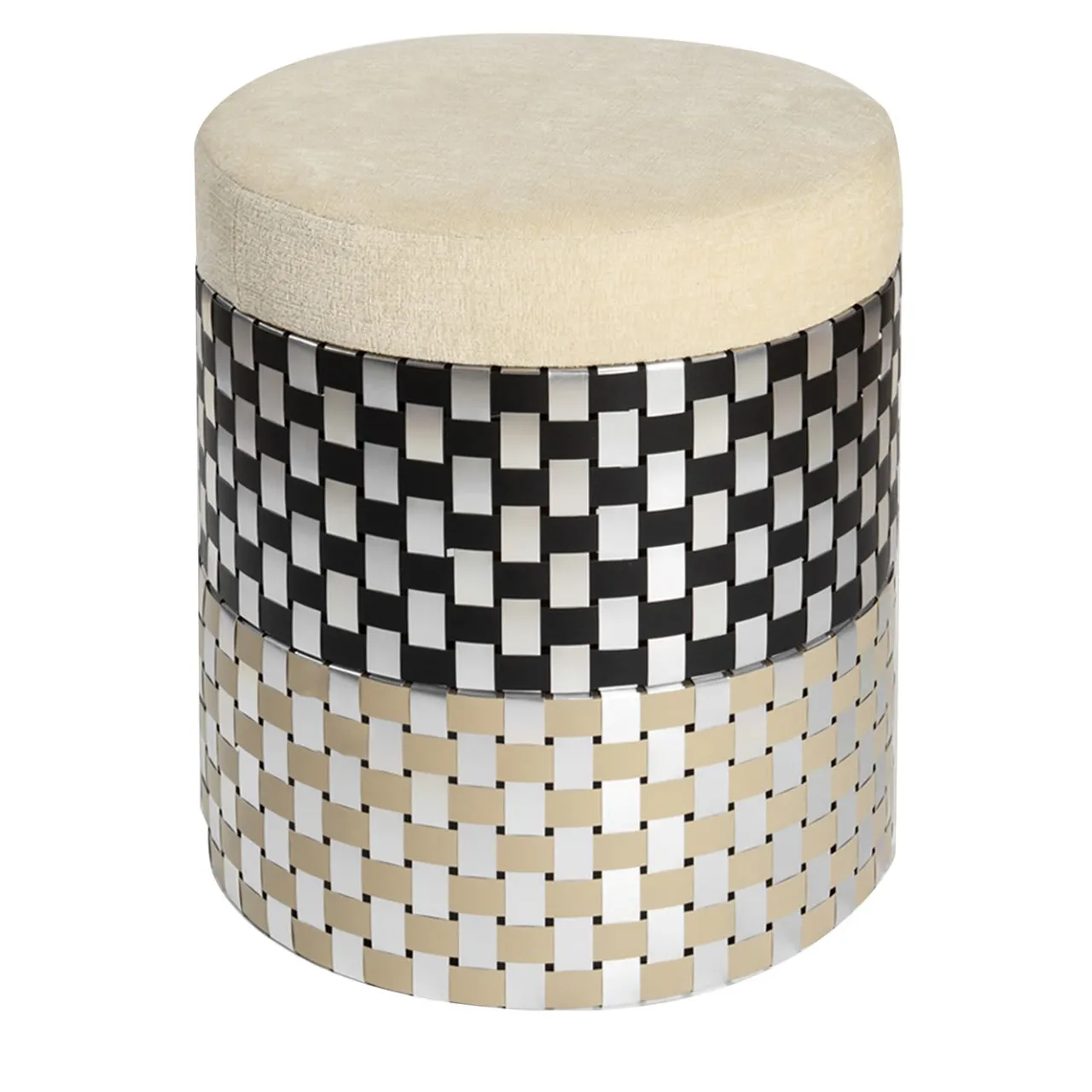 Semplice nella forma ma ipnotizzante nel design, questo pouf cilindrico prende il nome da Vesta, la dea vergine del focolare, della casa e della famiglia nell’Antica Roma. Sormontato da un cuscino di seduta rotondo e soffice, la sua silhouette a rotelle è composta da fogli di alluminio riciclato nelle finiture nero, oro e naturale, ordinatamente intrecciati per creare un look accattivante e scintillante – chiamato Splot Optical – che rende omaggio all’Optical Art che prosperava negli anni Sessanta.