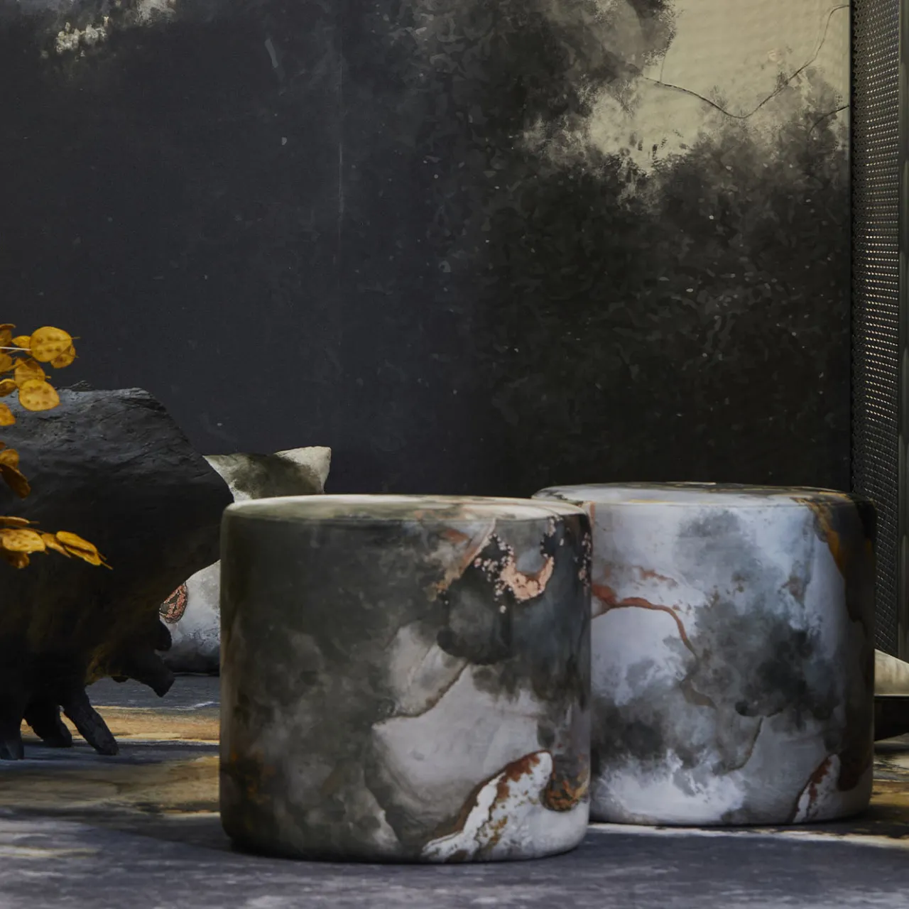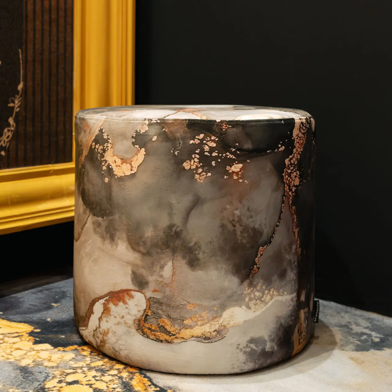 Un pouf rotondo con una grafica a tema vulcanico stampata su un tessuto effetto velluto. La struttura morbida e imbottita offre posti a sedere aggiuntivi confortevoli o funge da poggiapiedi. Questo pouf si distingue per il suo design unico che aggiunge una personalità speciale a qualsiasi stanza. La copertura è removibile e può essere personalizzata con qualsiasi immagine di Instabilelab, combinando funzionalità con espressione artistica. Contatta il Concierge per ulteriori dettagli.