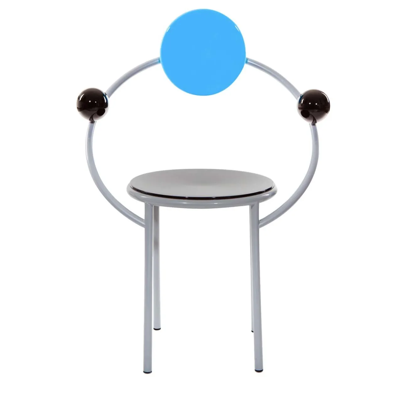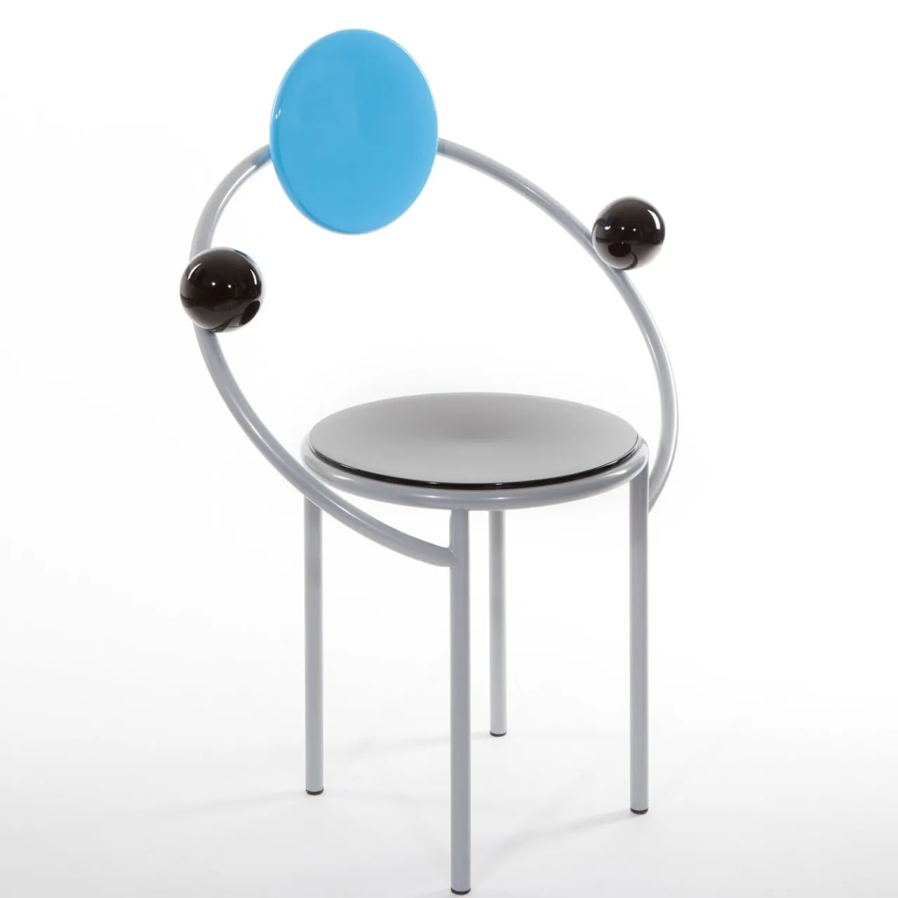 Questa sedia, disegnata da Michele De Lucchi nel 1983 per Memphis, sarà un’aggiunta superba a una sala da pranzo contemporanea, a uno studio o a un ingresso, se usata come pezzo unico. Il design sofisticato evoca le orbite planetarie in una combinazione di legno e metallo smaltato che crea elementi argentati, blu e neri che si collegano tra loro per creare la seduta e lo schienale ritagliato.