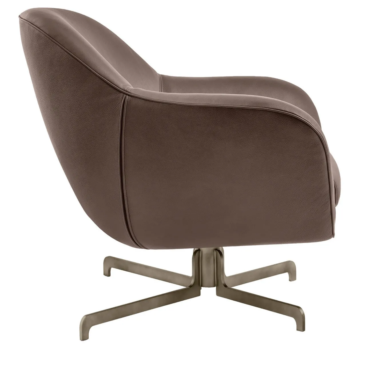 Perfettamente adatta a qualsiasi salotto moderno, camera da letto o area commerciale, questa splendida poltrona girevole sfoggia una silhouette di ispirazione anni ’50 realizzata con materiali nuovi e pratici. Rivestita in pelle marrone impreziosita da un elegante bordino, presenta un’accogliente seduta in multistrato di abete fissata con cinghie elastiche di 6 cm e un ampio schienale leggermente svasato in multistrato di pioppo curvato. Interamente imbottito in poliuretano espanso e memory foam racchiuso in una lastra acrilica, il pezzo è completato da una base girevole in metallo verniciato a polvere.