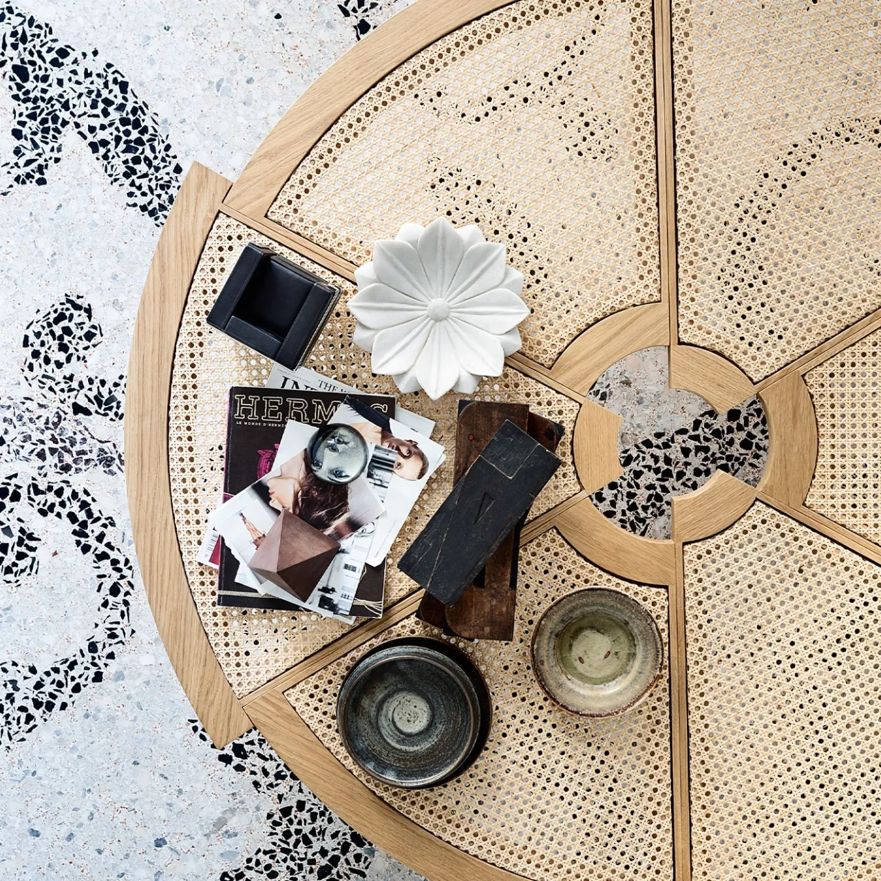 Rio – Tavolo in rovere naturale e paglia di Vienna. Attualmente disponibile in un’unica dimensione, il tavolino Rio è stato originariamente creato da Charlotte Perriand in due dimensioni. Tra il 1962, anno in cui lo disegnò, e il 1967, Charlotte Perriand ne realizzò una versione più grande destinata all’ambasciata giapponese a Parigi. L’insolita bellezza del tavolo Rio, unita alla sua funzionalità, lo rende una vera e propria opera d’arte. I sei segmenti, realizzati in legno massiccio, ognuno con un raggio diverso, sfalsati tra loro, creano un bordo esterno frastagliato, mentre il foro al centro evoca un centro di gravità. Cassina ha rieditato la versione originale nel 1962, riproducendo le linee originali, grazie anche alle straordinarie capacità artigianali degli artigiani di Meda, cittadina della Brianza a nord di Milano.