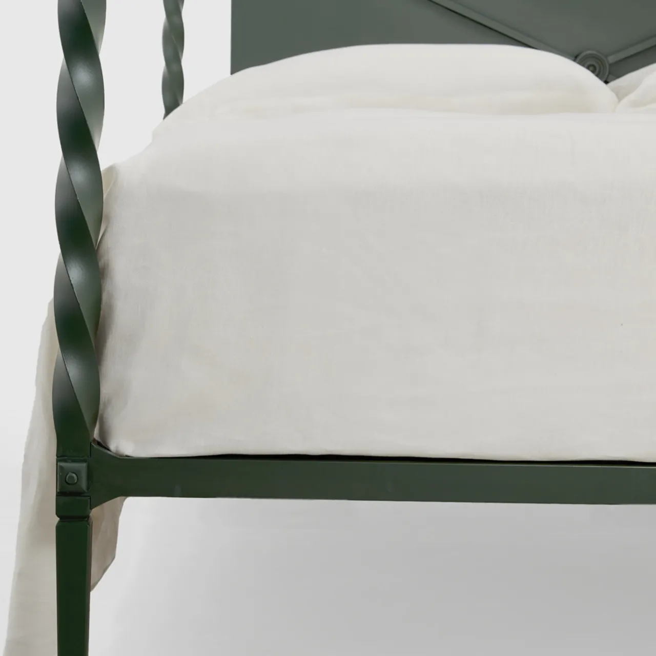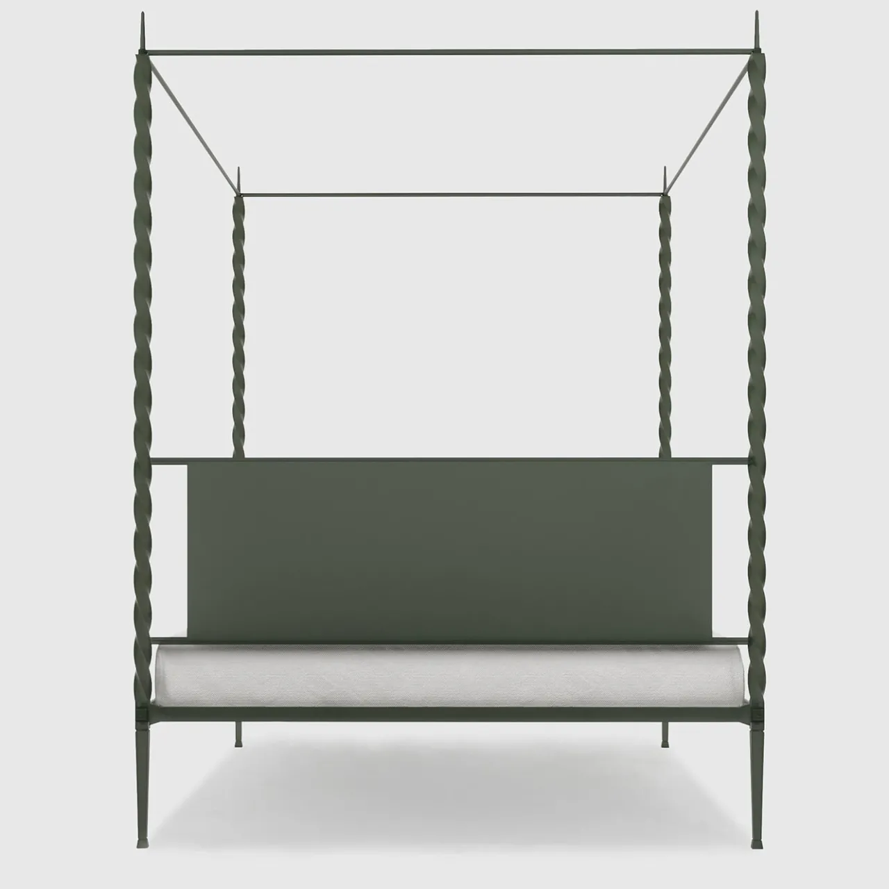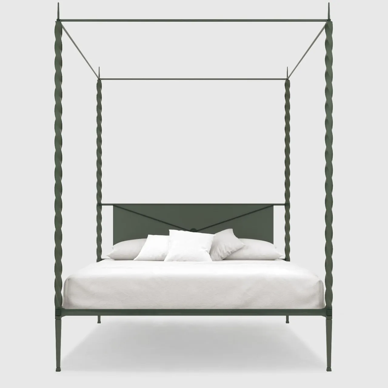 L’intramontabilità e l’affidabilità di una solida struttura in ferro trafilato incontrano il fascino intrigante dei profili verticali a spirale in questo sorprendente letto matrimoniale a baldacchino forgiato a mano. Innesti nascosti ne consentono il facile smontaggio, mentre l’intimità è favorita dalla lastra metallica insonorizzata che, insieme agli elementi tubolari incrociati, compone la testata. Reinvenzione artistica del classico letto a baldacchino, è disponibile anche in una romantica variante rosa.