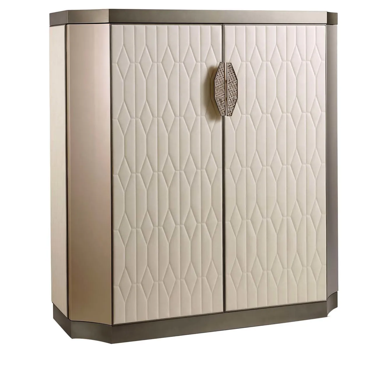 Questa collezione dimostra l’unicità del marchio, esaltando il genio creativo. Un mobile realizzato con pannelli a base di legno, con base e piano rifiniti in brunitoio, e maniglie in metallo con finitura in ottone e piccolo mosaico. L’esterno è rivestito in tessuto tono su tono, l’interno è rifinito in metallo liquido laccato. Gli specchi sono sul letto e le luci a LED sulle mensole, rifinite con tappetini in pelle.