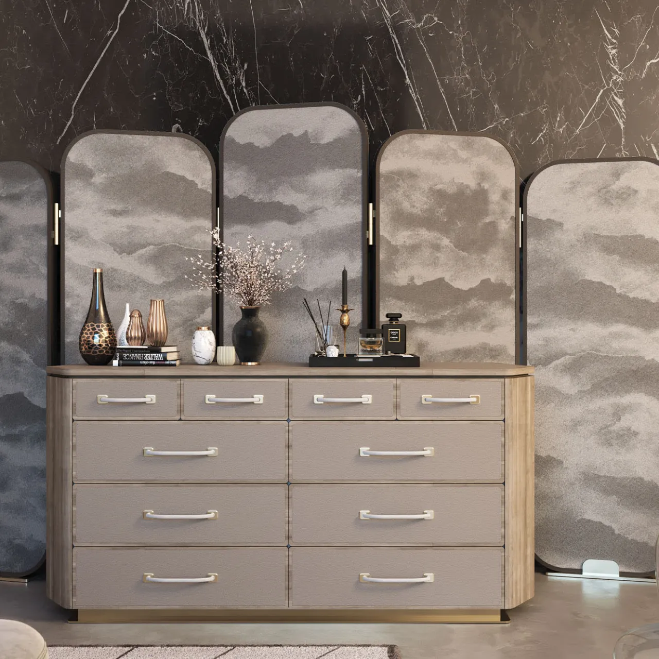 Questa zanzariera per la privacy fonde senza sforzo l’artigianato tradizionale con l’eleganza contemporanea. I pannelli in legno sono laccati in nero e i bordi delicatamente arrotondati rispecchiano il motivo nuvoloso del rivestimento in pelle. I pannelli possono essere regolati per consentire vari livelli di luce e di privacy, per adattarsi a diversi stati d’animo e occasioni. I pannelli sono collegati da cerniere metalliche, che consentono di disporli senza problemi in qualsiasi stanza, a seconda delle esigenze e delle preferenze.