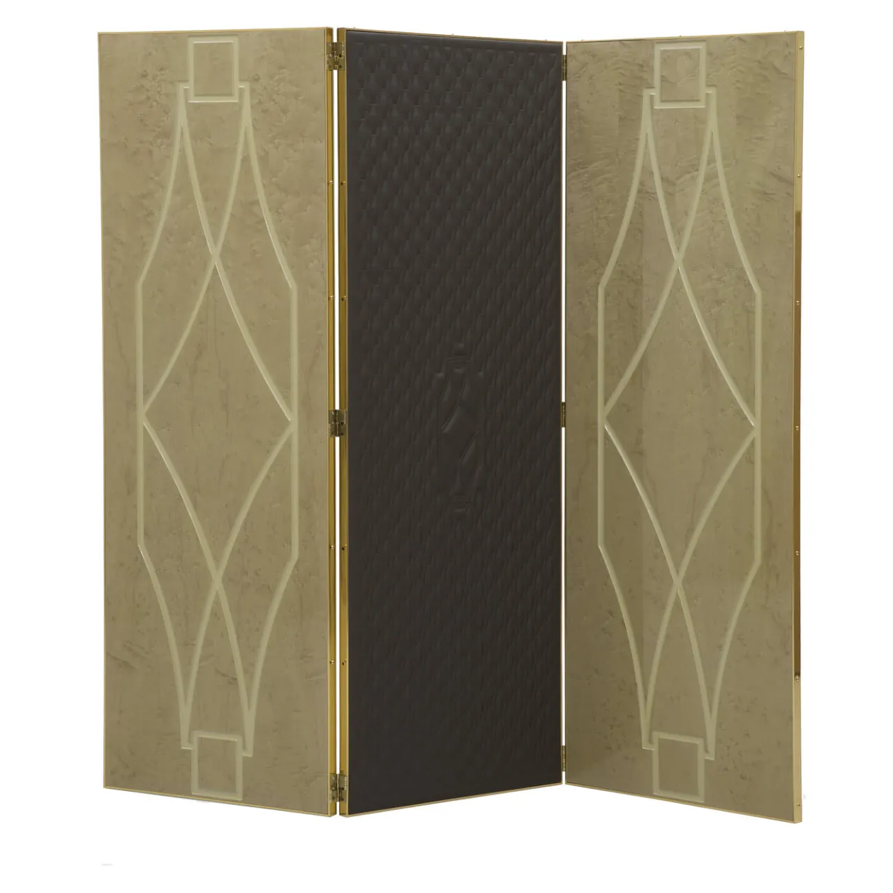 Evoquando il glamour del passato con una silhouette moderna, questo elegante schermo a 3 pannelli ha un fascino vintage che completerà sia l’arredamento classico che quello moderno. Interamente incorniciato in ottone lucidato, i pannelli laterali sono realizzati in acero eyebird color sabbia con incisioni stilizzate che richiamano il design del pannello centrale rivestito in pelle marrone trapuntata. Completato su entrambi i lati, il retro è interamente di un colore beige laccato neutro. La miscela di colori e texture crea un pezzo visivamente affascinante che può essere utilizzato come divisorio per stanze o puramente come punto focale decorativo.