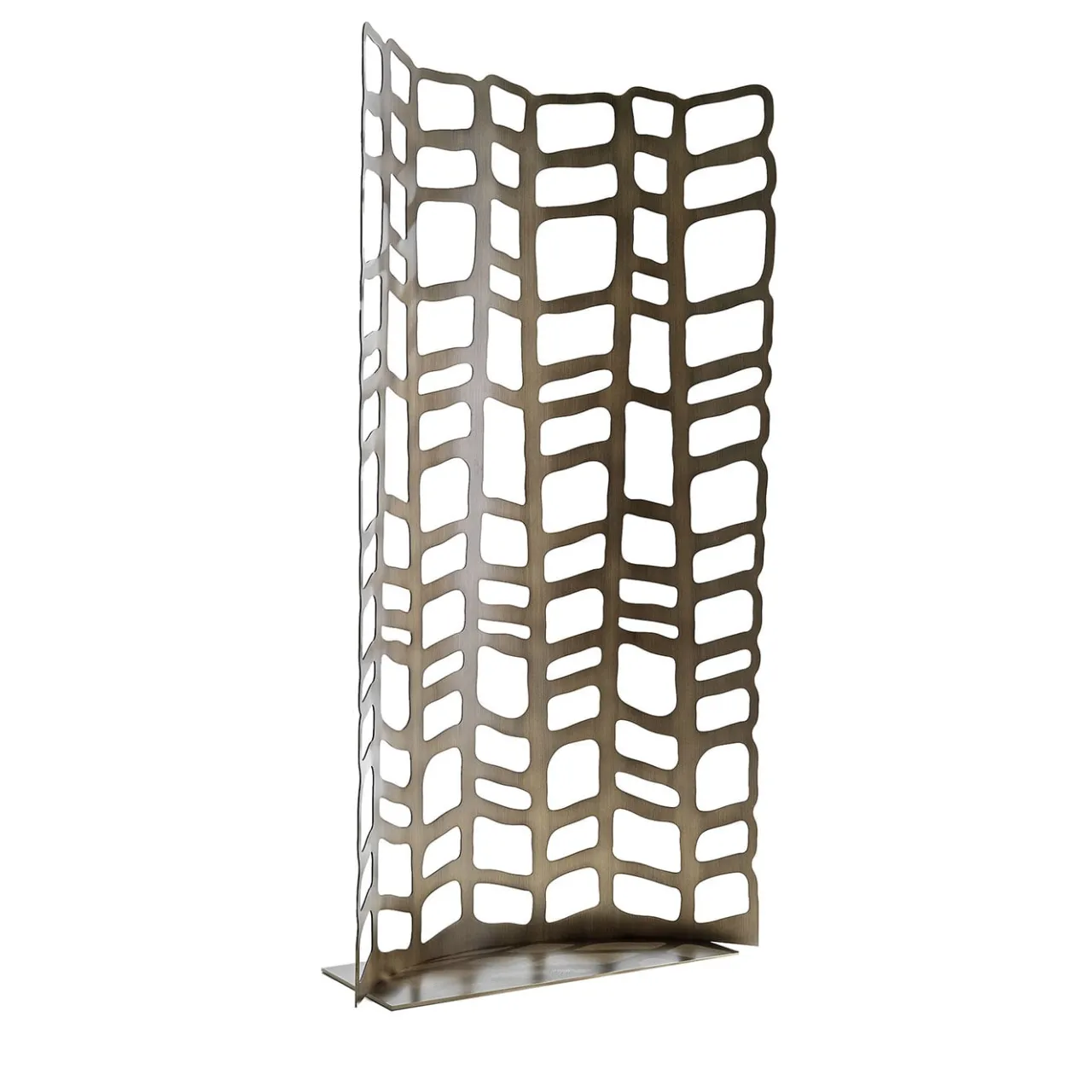 Un design intelligente per infondere un po’ di intimità a un angolo di lettura senza compromettere lo stile, questo paravento in acciaio inossidabile rifinito in bronzo galvanico satinato presenta un ipnotizzante motivo traforato che permette alla luce di filtrare. Si distingue per la forma leggermente curva che ne esalta il fascino scultoreo. Viene fornito con una base tranquilla e coordinata.