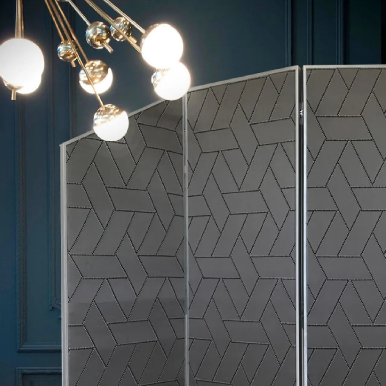 Questo squisito paravento è stato realizzato da esperti artigiani come oggetto funzionale e decorativo ispirato allo stile art déco. La sua silhouette elegante e i suoi motivi decorativi geometrici arricchiranno una stanza, creando un’atmosfera sofisticata. I pannelli sono in metallo con finitura argentata e sono interamente rivestiti in tessuto grigio grafite con intarsi in argento e nero. La base è coperta da uno specchio con finitura grigia. Sul retro, due dei pannelli sono rivestiti di specchio, per rendere questo pezzo un’aggiunta versatile e unica a qualsiasi arredamento.
