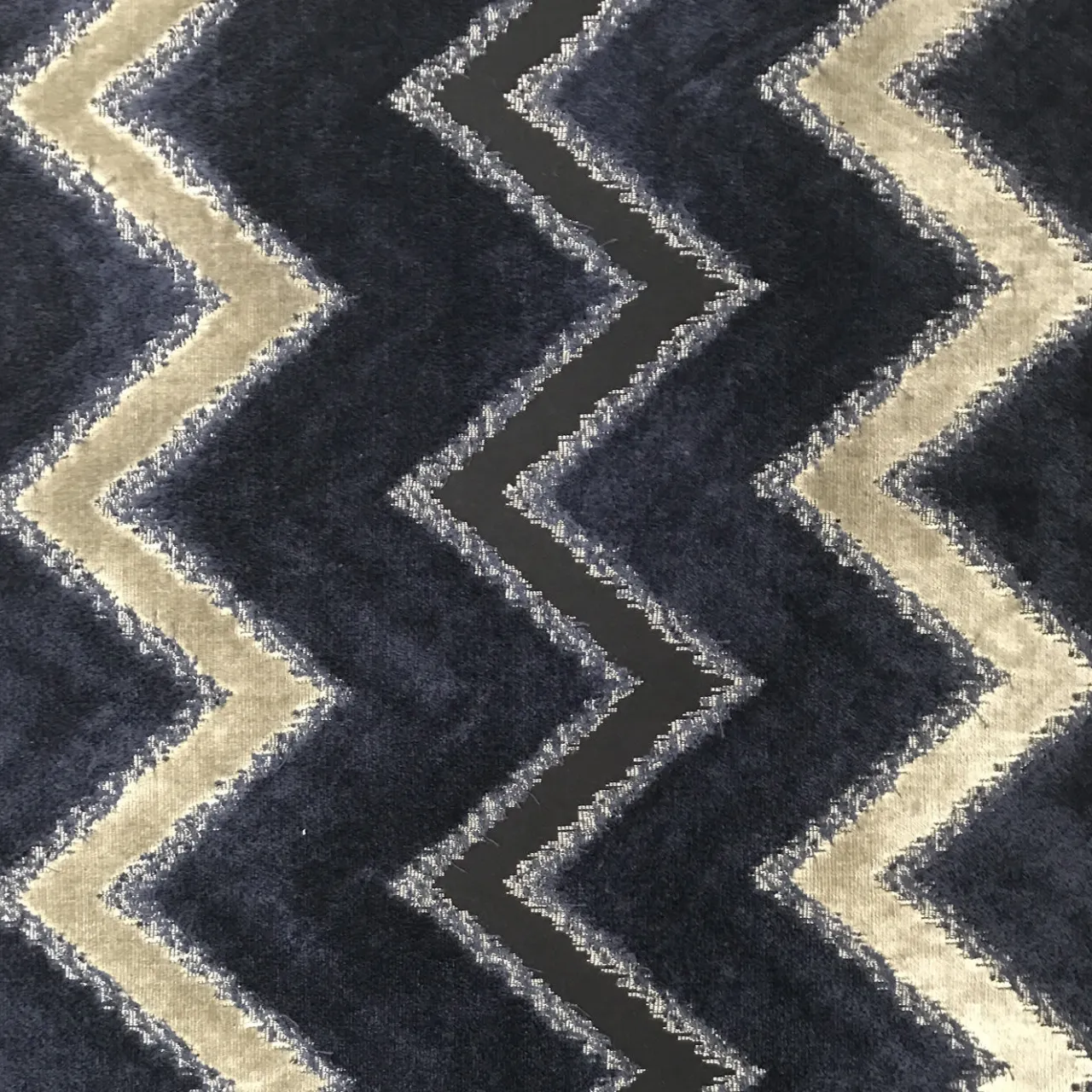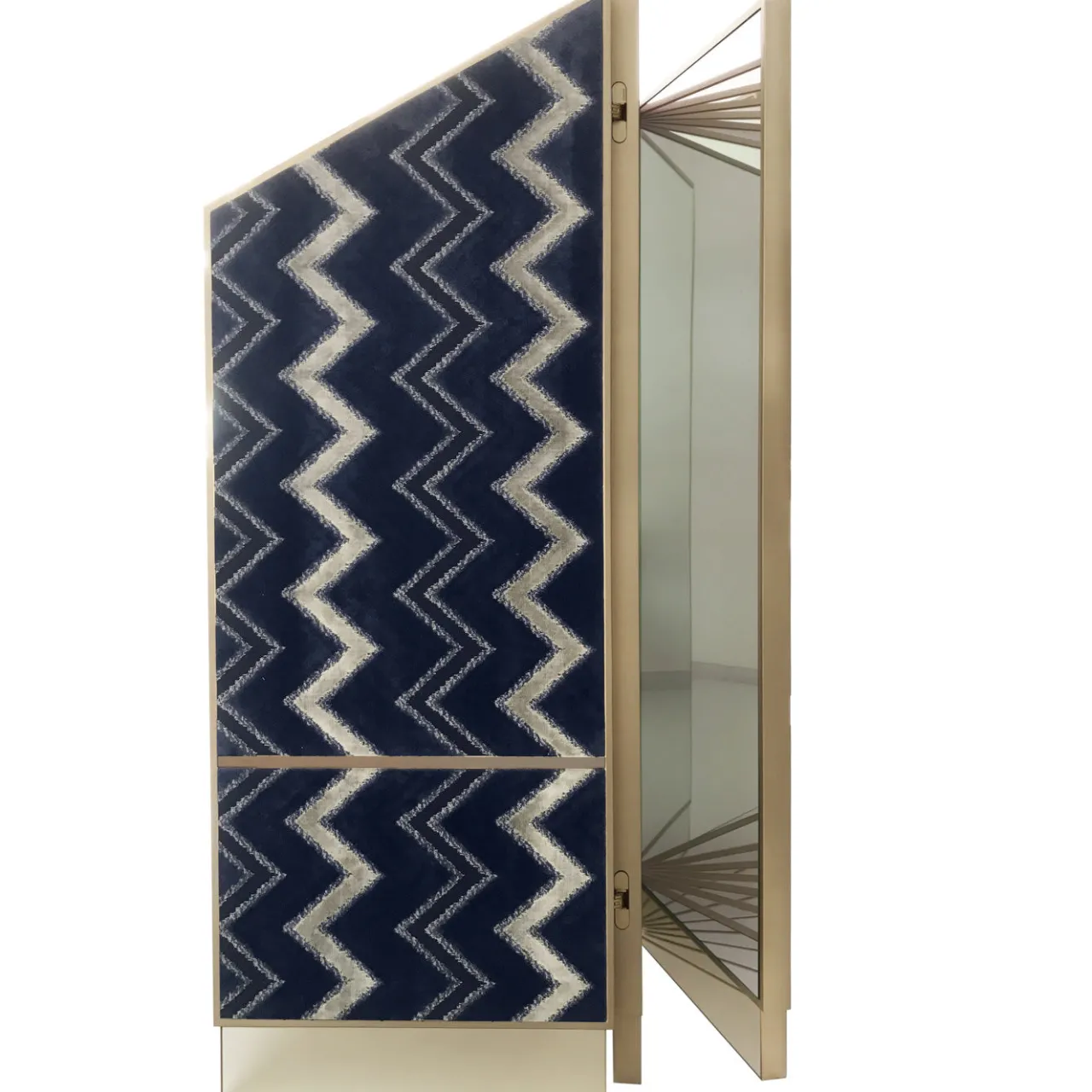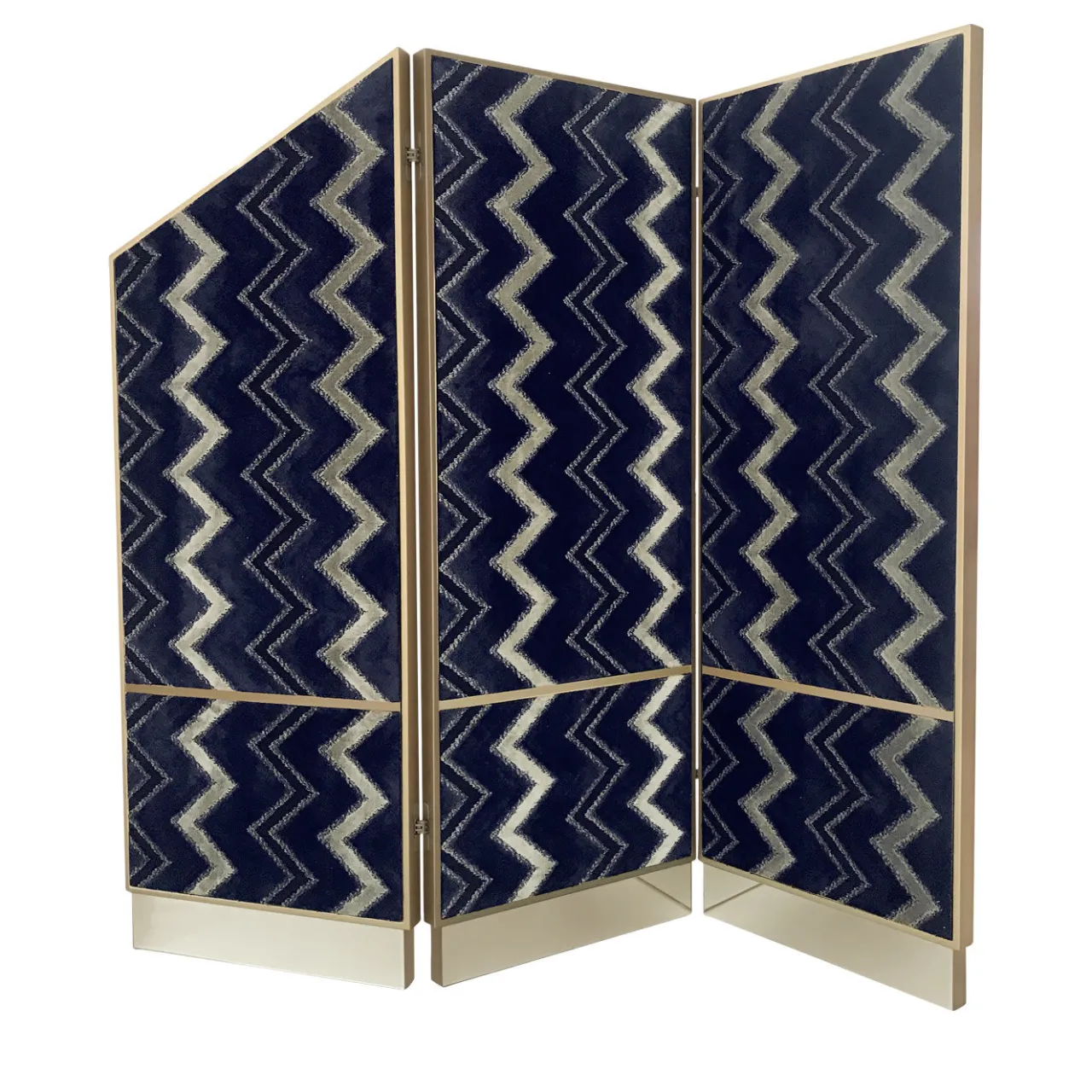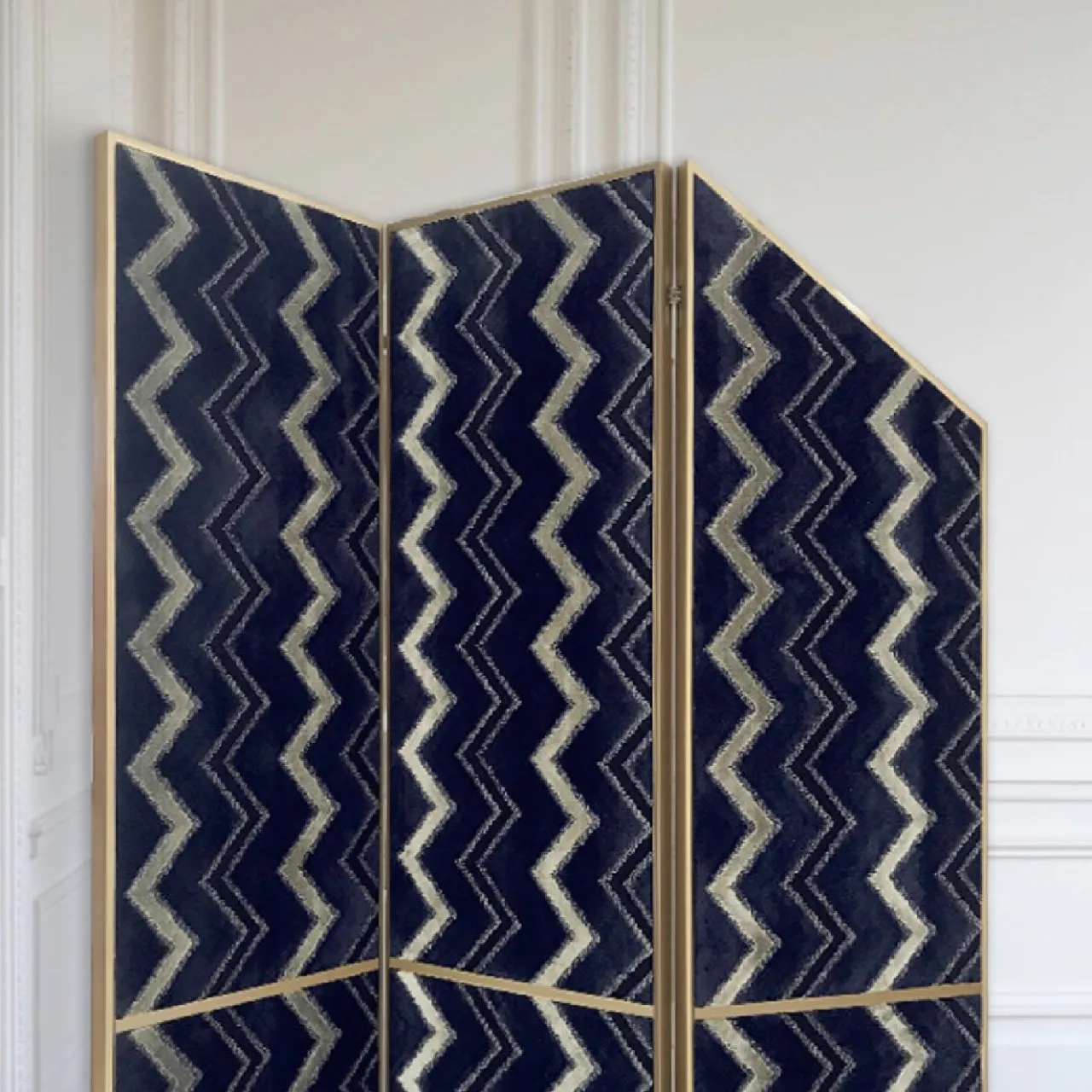 Questo superbo paravento è stato realizzato interamente da maestri artigiani con tecniche artigianali. La sua silhouette geometrica, ispirata all’art déco, arricchirà qualsiasi arredamento. I tre pannelli poggiano su una base a specchio con finitura argento chiaro, che compare anche nei due pannelli posteriori. La struttura in ottone spazzolato aggiunge un accento sofisticato ai pannelli e completa i motivi decorativi astratti del tessuto che li riveste in un elegante colore blu scuro con intarsi dorati e neri.