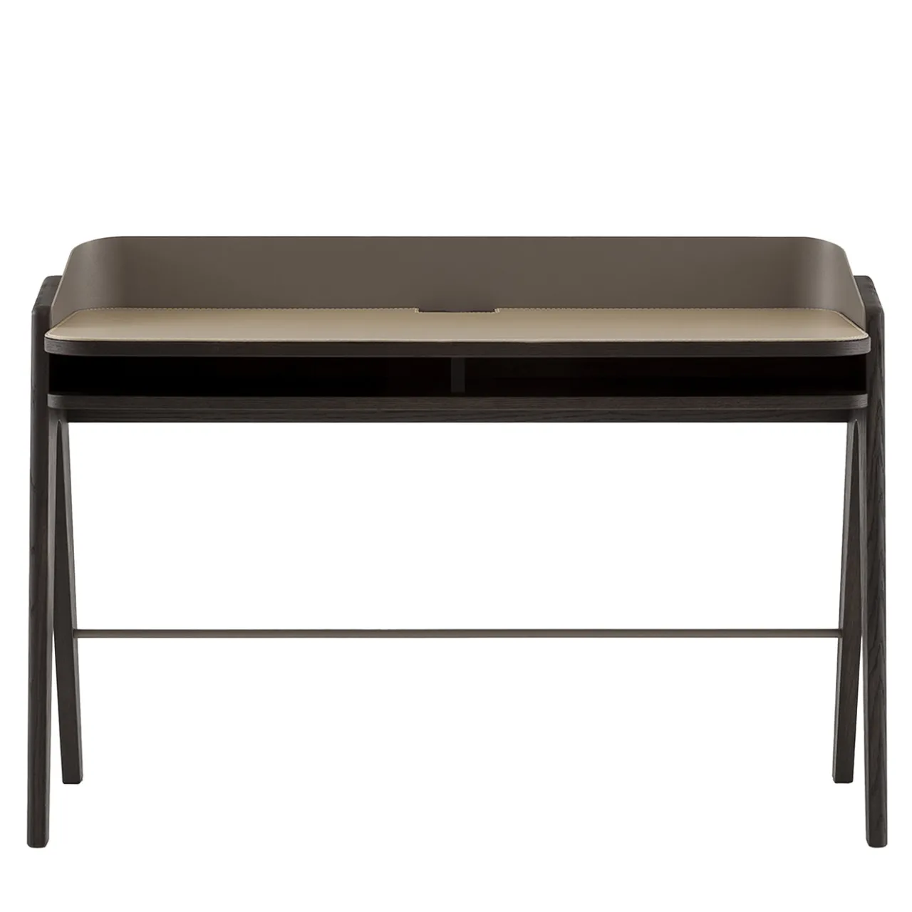 La scrivania Bavero in metallo e legno di rovere combina un elegante telaio in metallo con un morbido pad in pelle di beige naturale per un comfort raffinato. Sostenuta da solide gambe in rovere, la scrivania presenta un design senza cuciture, senza viti visibili, creando un aspetto artistico unitario. La sua struttura metallica curva circonda lo spazio di lavoro, offrendo una superficie di scrittura moderna ma funzionale, ideale per ambienti di lavoro intelligenti.
