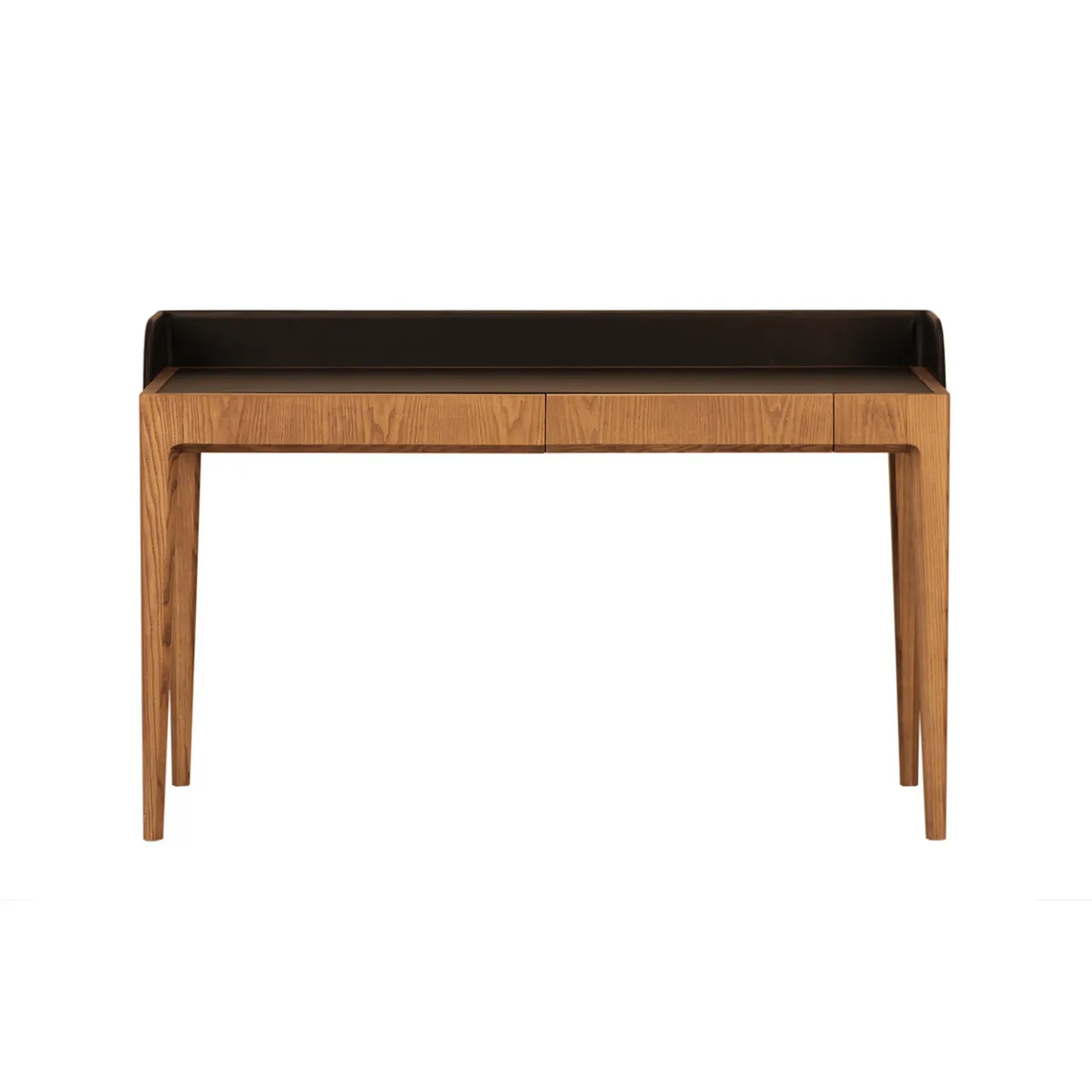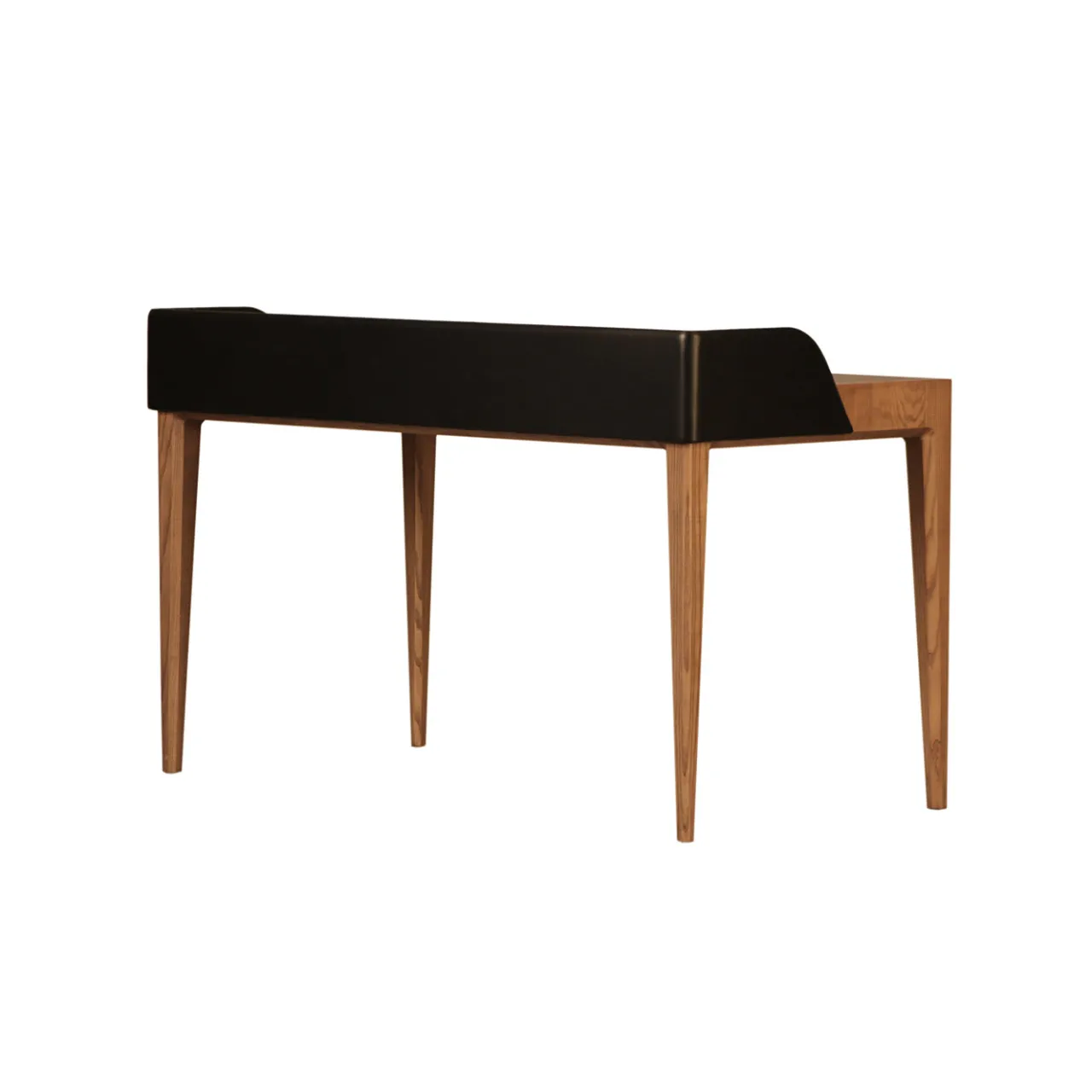 Ricca di fascino lussuoso, questa scrivania d’eccezione sarà un’aggiunta affascinante agli arredi contemporanei. La struttura in legno di frassino con finitura durmast è composta da quattro gambe affusolate e sottili che sostengono un piano d’appoggio a forma di parallepipedo rivestito in pelle pregiata. Un ulteriore elemento decorativo che ne esalta lo stile moderno è la curva, anch’essa rivestita in pregiata pelle nera, che delimita metà del perimetro del piano. Questa elegante scrivania include un cassetto portaoggetti compatto e il piano può essere aperto con un ampio vano portaoggetti segreto. Progettato da Lbero Rutilo.