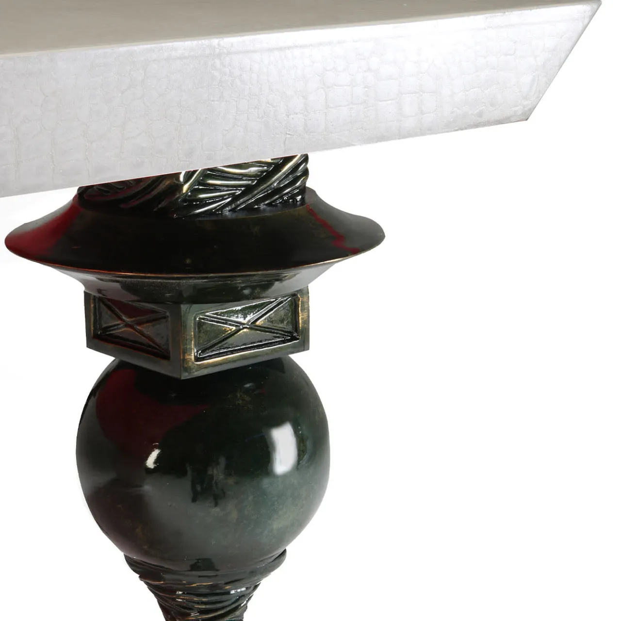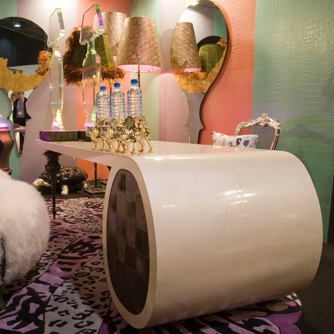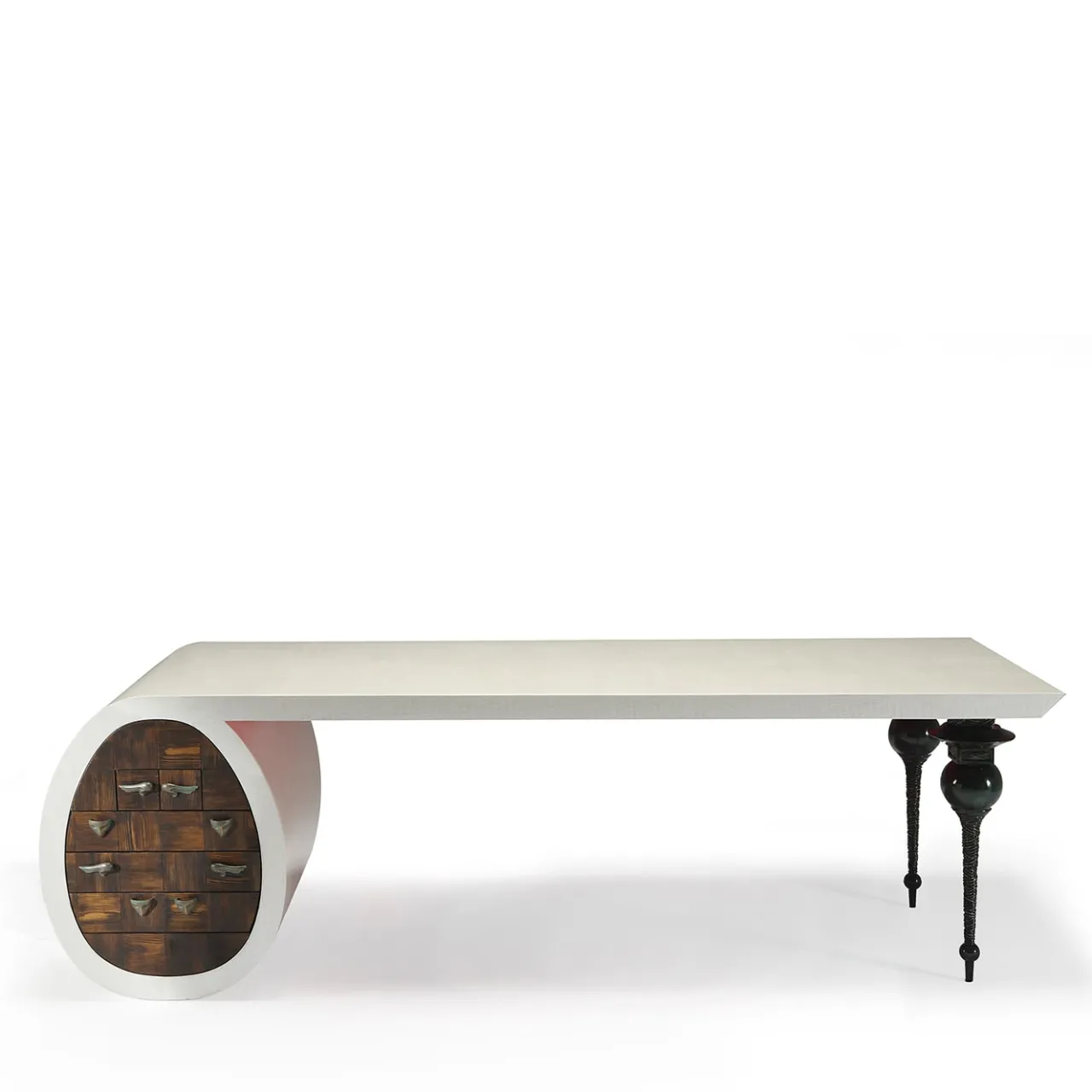 Questo superbo oggetto di arredamento funzionale è la controparte rivestita in pelle della scrivania Caos Metallica. La sua struttura è uno splendido accento decorativo in una casa moderna o contemporanea, dove le sue grandi dimensioni fungeranno anche da versatile superficie di lavoro. La struttura della scrivania è in legno con una base ovale da un lato e due gambe ornate con finitura in bronzo dall’altro, che sostengono il piano rettangolare. La struttura ovale è una cassettiera il cui frontale è in larice antico con maniglie in bronzo. Il piano è in stampa coccodrillo bianco, con la parte inferiore del piano in rosa delicato. Disegnato da Carlo Rampazzi.