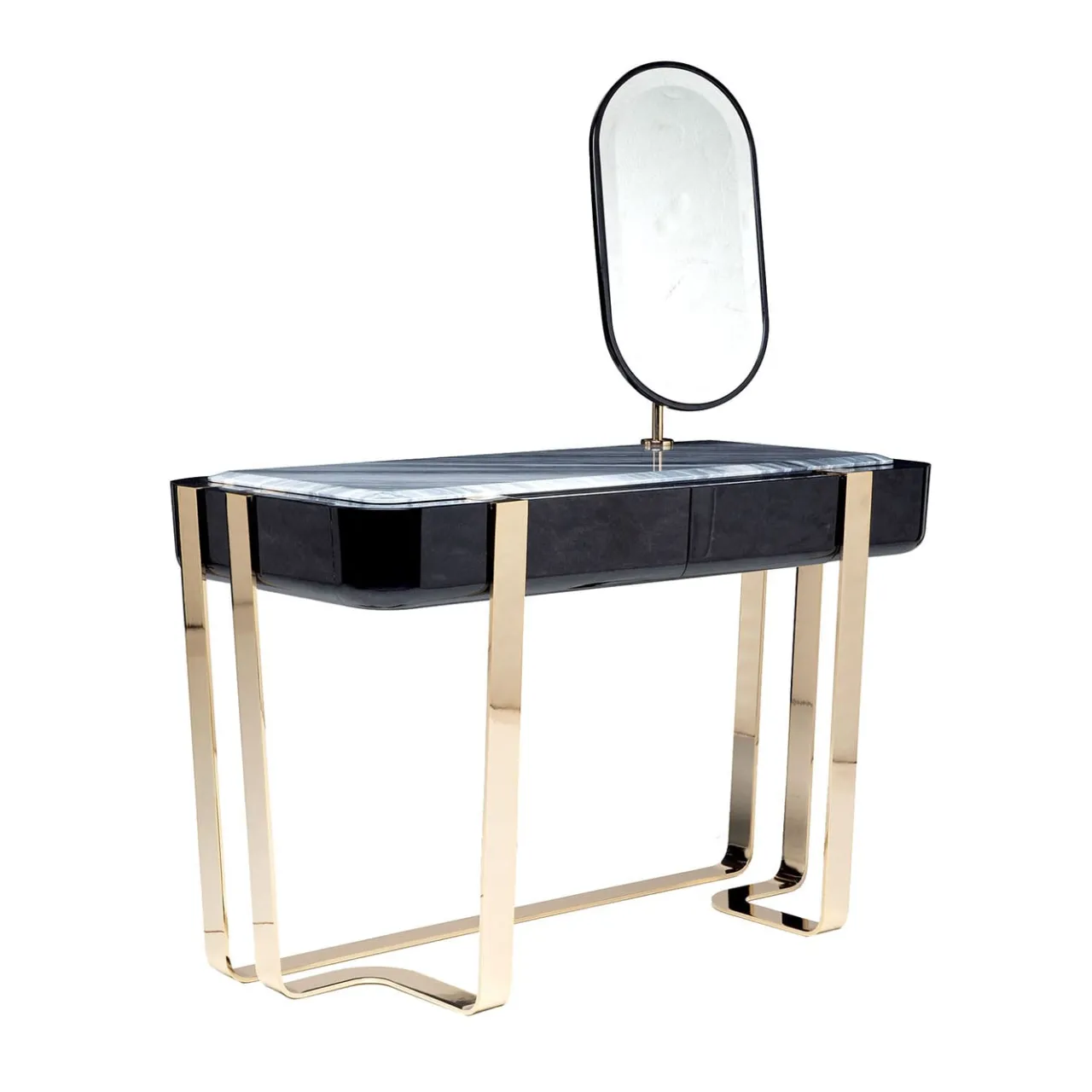 Questo raffinato vanity desk è caratterizzato da un’impiallacciatura in radica di Bubinga nero con finitura in poliestere lucido, che offre una lussuosa esperienza tattile. Il piano in marmo Grigio Alpi smussato aggiunge un tocco di raffinatezza, mentre le gambe in acciaio inox cromato oro chiaro con il logo della Collezione Giorgio costituiscono una base moderna ed elegante. Progettata da Castello Lagravinese Studio, la scrivania Charisma è l’ultima fusione di stile senza tempo e funzionalità contemporanea.
