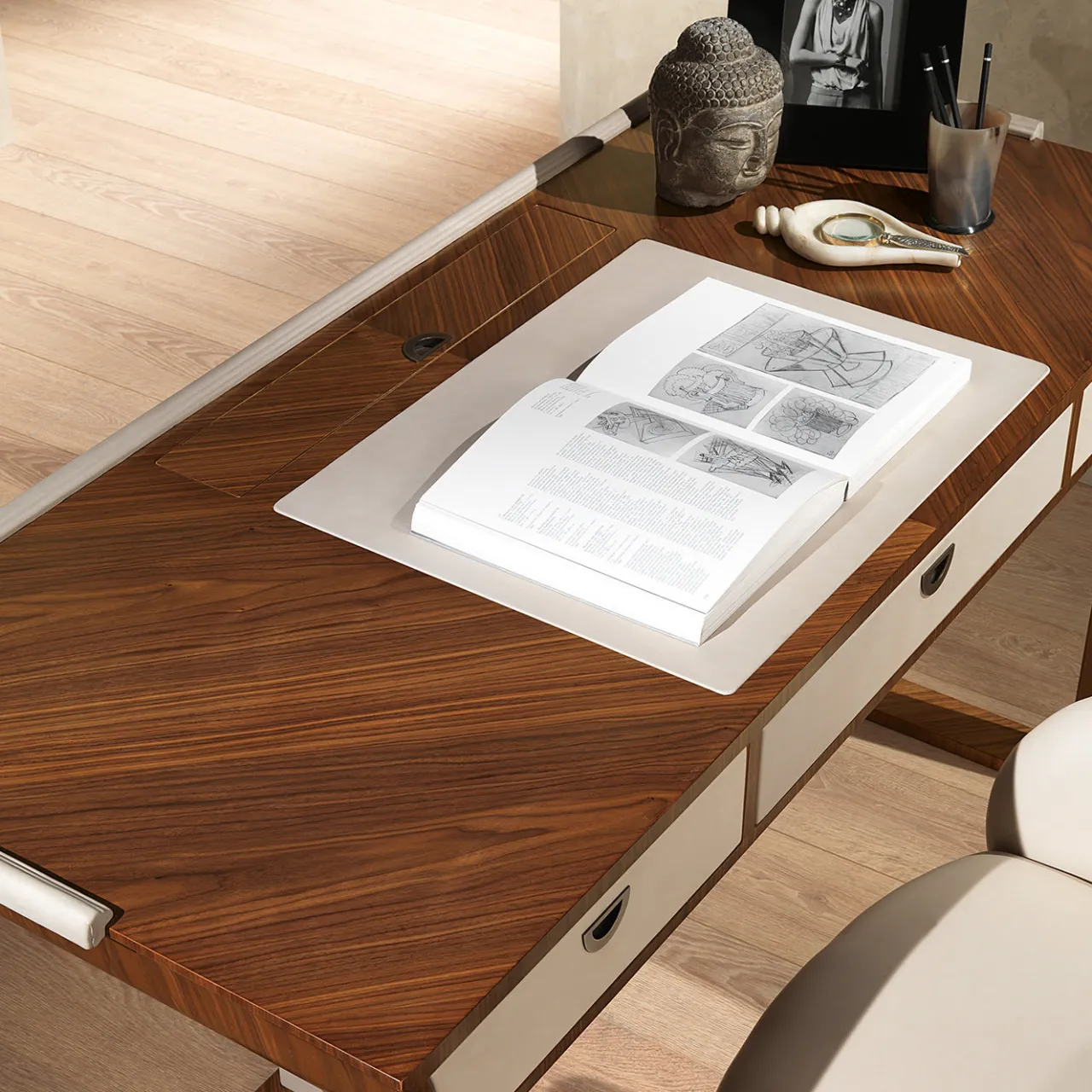 Fondendo elementi classici e contemporanei, lo scrittoio Desyo è realizzato in noce canaletto e pelle nabuk. Dotata di tre cassetti, la scrivania offre ampio spazio per riporre calcolatrici, penne, cavi e altro ancora per lasciare in ordine il vostro spazio di lavoro. Grazie alla sua struttura armoniosa, la scrivania crea un luogo rilassante per lavorare da casa.