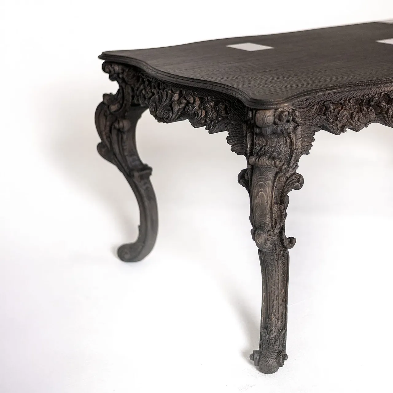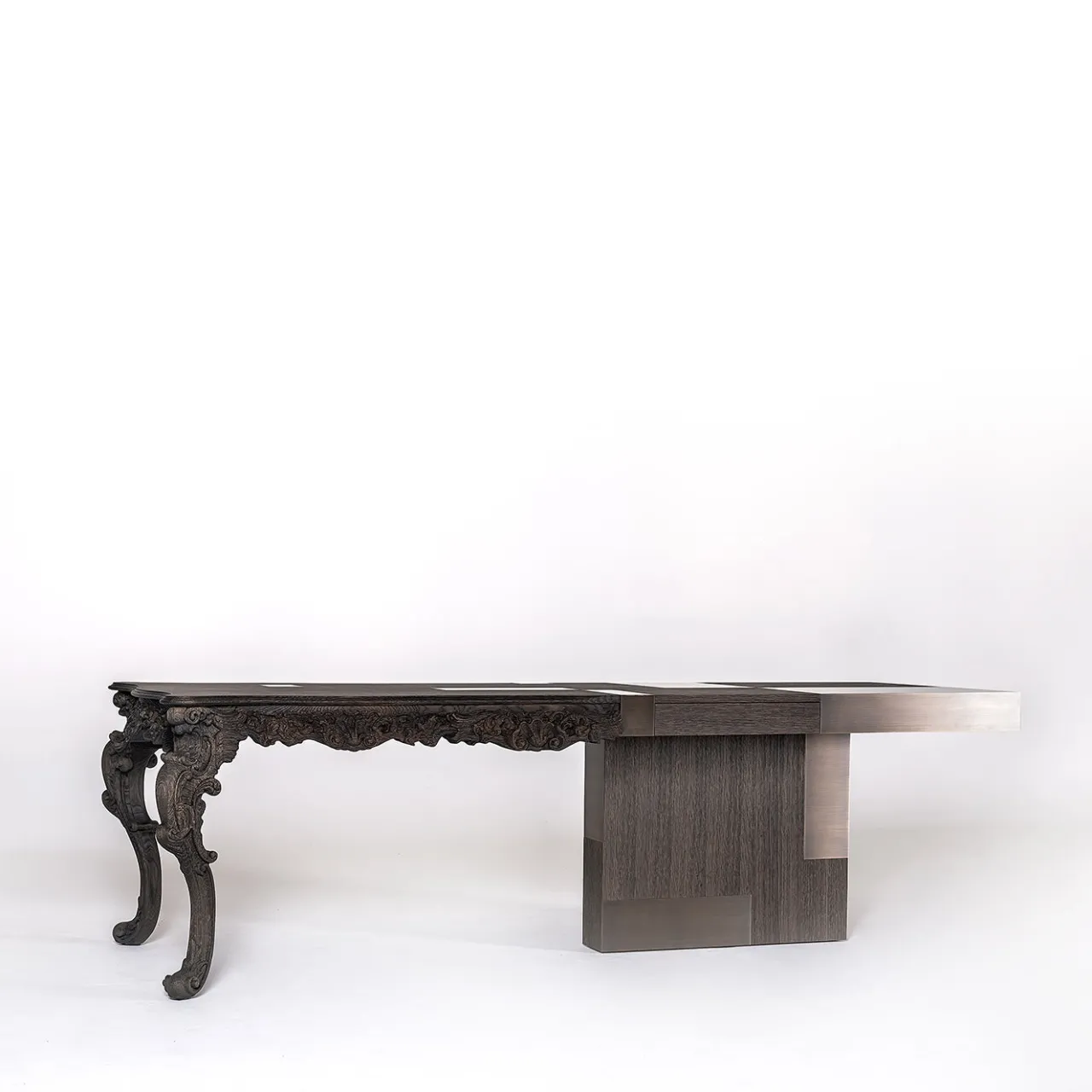 La scrivania Evo combina tecniche di lavorazione del legno tradizionali e moderne. Il lato classico è realizzato con blocchi di legno massiccio intagliati a mano, mentre il lato moderno è caratterizzato da legno multistrato impiallacciato. Il piano è costituito da pannelli impiallacciati con bordo in legno massiccio e l’intera scrivania è sabbiata per una finitura raffinata. Sul lato moderno, su richiesta, è possibile aggiungere un cassetto con guide in legno. Per ulteriori informazioni, contattare il Concierge.