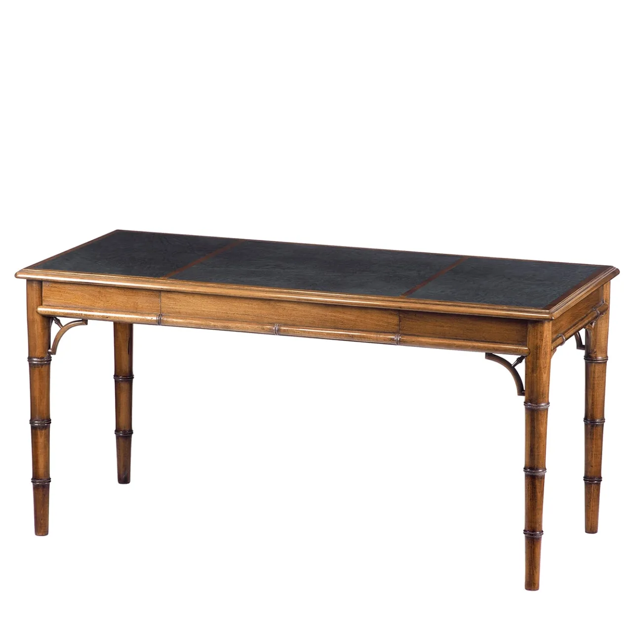 Questa singolare scrivania in faggio pregiato è un’impeccabile riproduzione di un originale Chippendale degli anni 1750-1779, un gioiello di ebanisteria caratterizzato da gambe affusolate simili a canne di bambù. Dotata di tre cassetti dove riporre fogli e altri oggetti di cancelleria, acquista ulteriore preziosità con l’aggiunta di inserti in pelle sul piano.