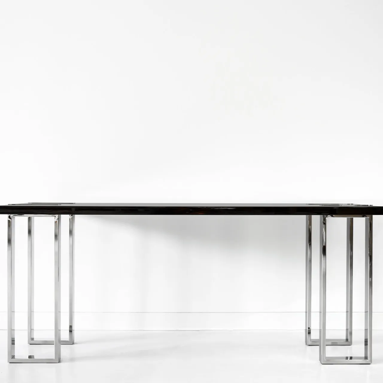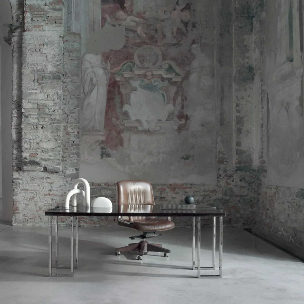 Questa scrivania, dal design accattivante e minimalista, è in grado di garantire uno spazio di lavoro chic sia a casa che in ufficio. Le gambe a slitta offrono sostegno e fascino visivo e rappresentano l’elemento distintivo di questo pezzo notevole, con dettagli a vista sui lati del piano in legno di ebano che conferiscono a questo design un aspetto più sostanziale nonostante la sua semplicità. Di dimensioni impressionanti, questa scrivania dispone di ampie superfici per ospitare tutti gli elementi essenziali dell’ufficio con spazio a sufficienza.