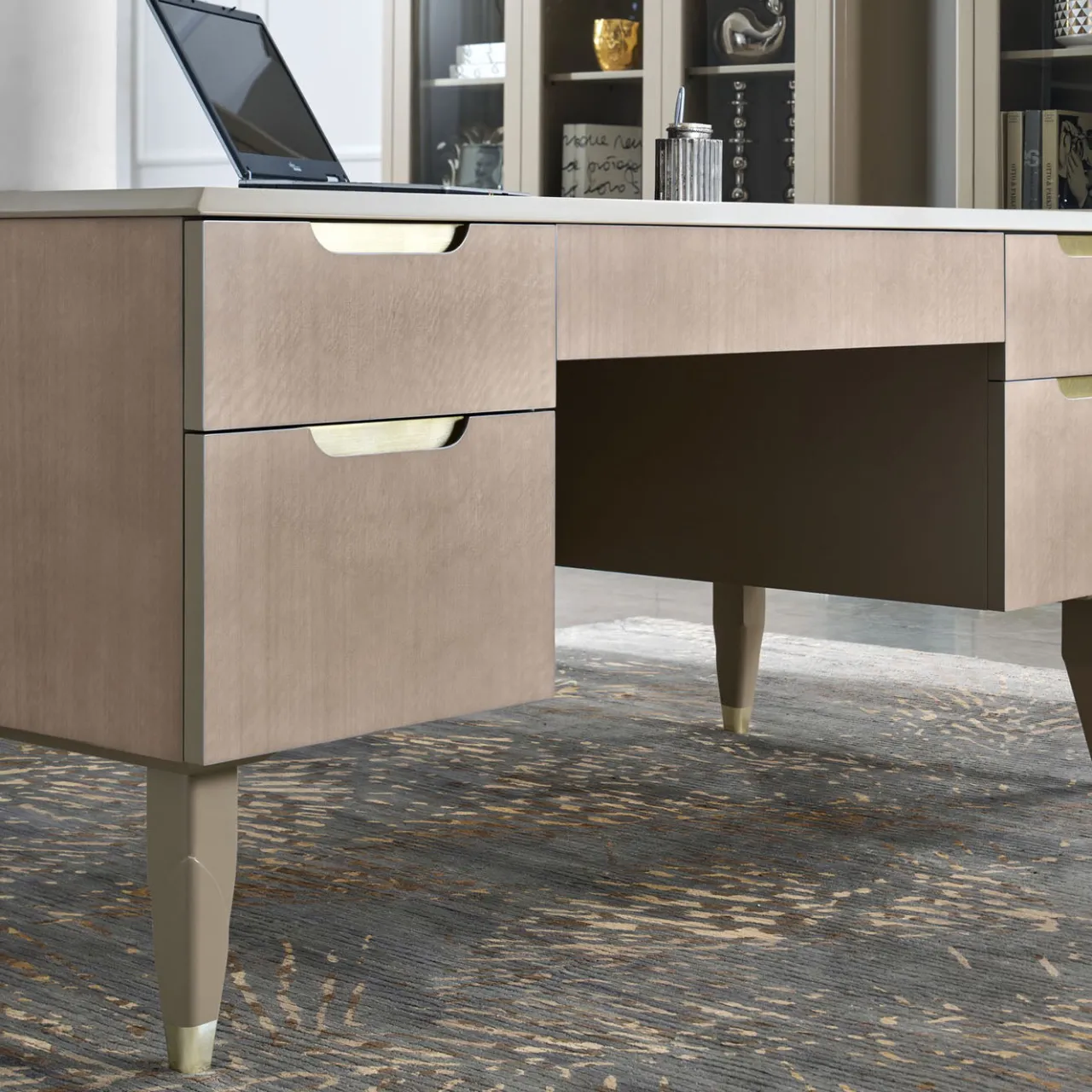 Questa scrivania presenta una struttura in legno Taupe Eucalyptus, offrendo una texture naturale e uno stile sofisticato per qualsiasi ufficio domestico. Si appoggia su gambe laccate grigio beige con raffinate maniglie in foglia di champagne, combinando funzionalità ed eleganza nel design. La scrivania include più cassetti per una conservazione organizzata, rendendola un pezzo centrale per spazi di lavoro efficienti.
