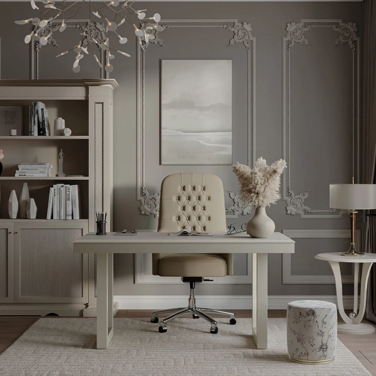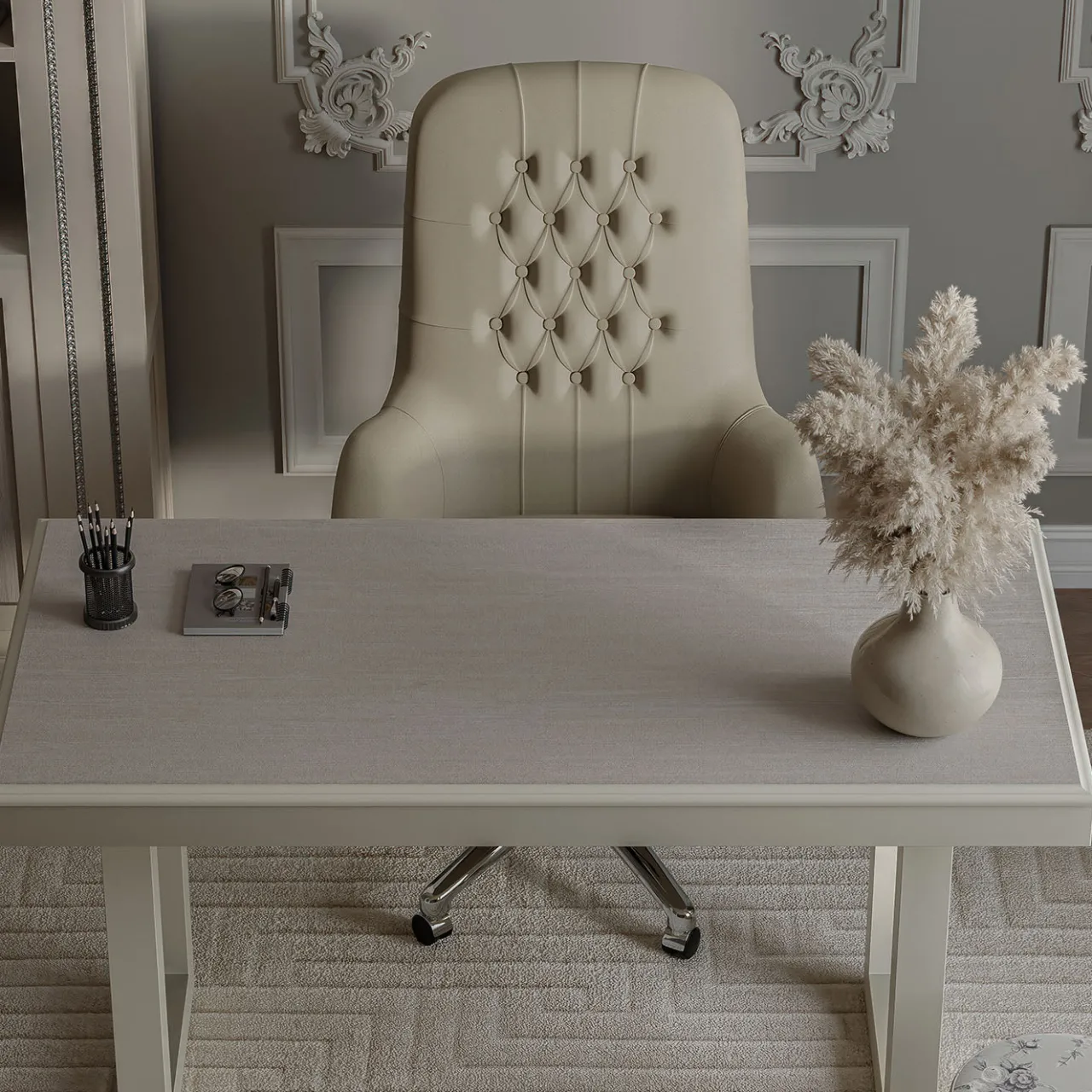Il tavolo console grigio in rovere argentato della collezione Studio Privè presenta un design raffinato con un piano in rovere argentato e una struttura grigio chiaro. I lati interni delle gambe sono adornati con delicati dettagli in foglia d’argento, aggiungendo un accento sottile ma sofisticato. La sua dimensione media si adatta a vari spazi per uffici o soggiorni, combinando praticità con uno stile elegante.