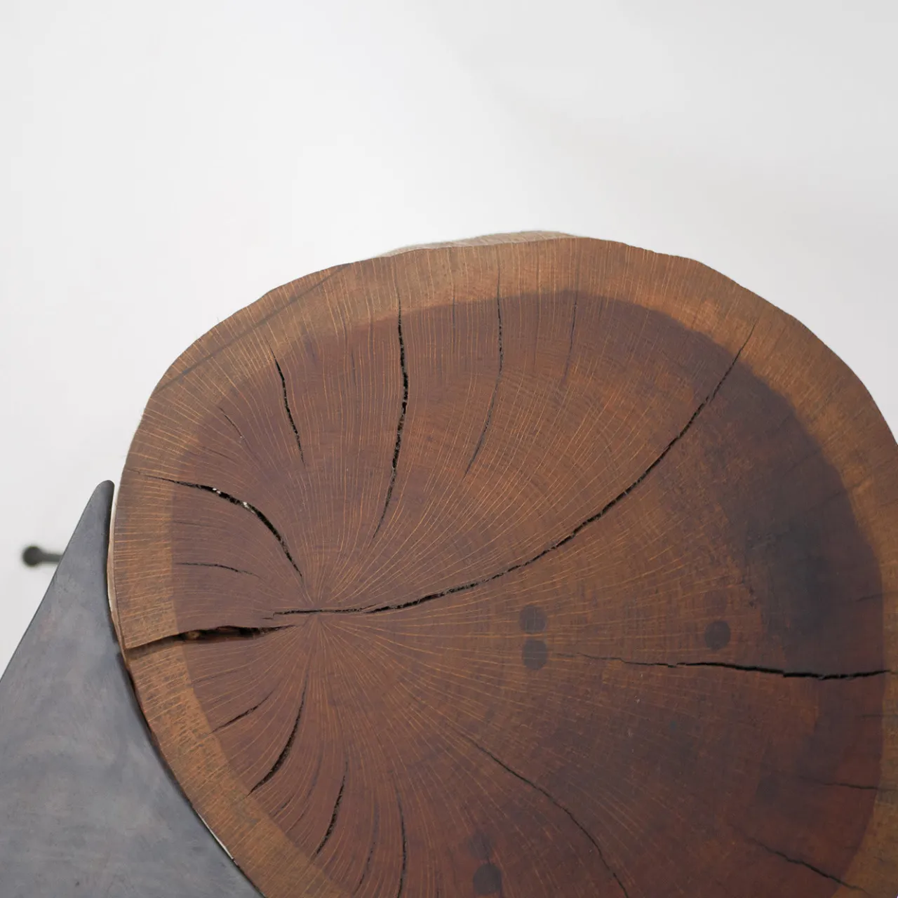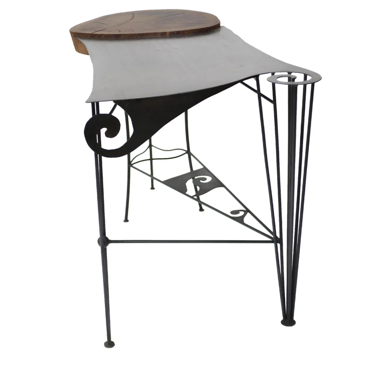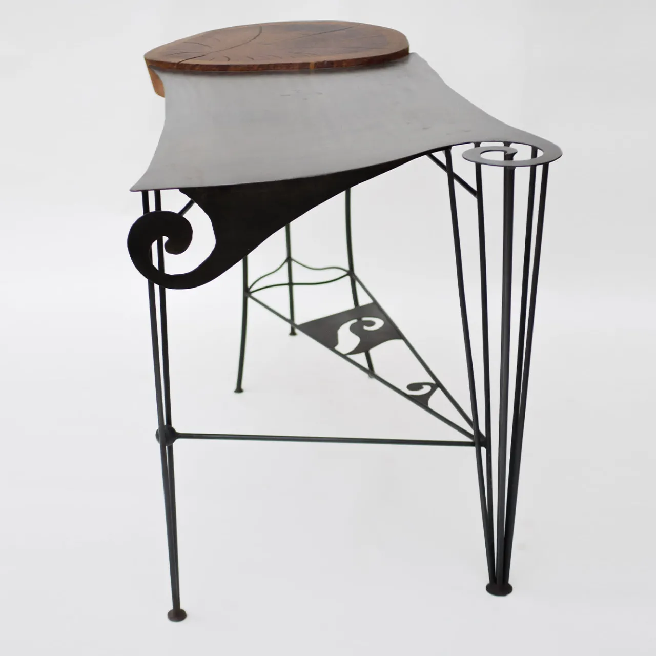 Splendido connubio tra rovere massiccio e ferro battuto, questa incantevole e sofisticata scrivania farà bella mostra di sé in qualsiasi studio privato o camera da letto. Le curve morbide e i dettagli arricciati che animano il piano e il tratto che collega le gambe risultano perfettamente in armonia con lo spesso inserto rotondo in rovere massiccio. Il calore del legno si fonde con la freddezza del ferro, dando vita a un design minuziosamente artigianale che emana armonia ed eleganza.