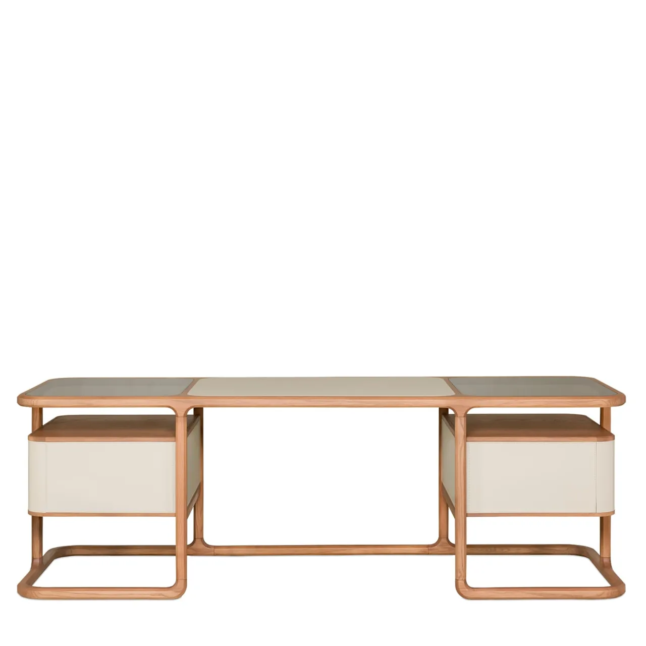 Il design minimale e l’estrema versatilità di questa raffinata scrivania bifacciale di Libero Rutilo sono ideali per gli spazi abitativi di piccole dimensioni che richiedono due postazioni di lavoro. Realizzata in frassino tornito per una silhouette sinuosa, presenta due piani laterali in vetro e uno centrale a scomparsa. Ogni lato è dotato di cassetti laterali a scomparsa e di due vani portaoggetti segreti. Misure 226x80x75cm.