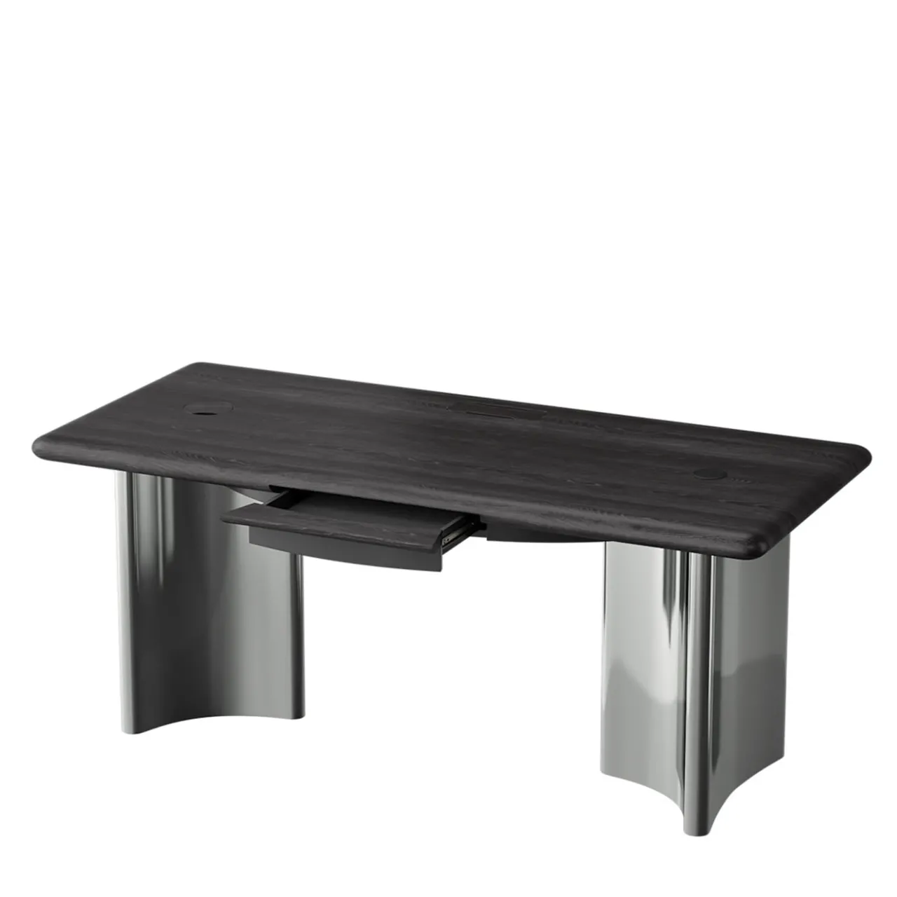 Scrittoio in rovere nero con basi scultoree in acciaio lucido. Il design evidenzia un piano d’appoggio elegante con bordi arrotondati, un cassetto integrato e una canalina passacavi nascosta per un’estetica pulita e raffinata. Una miscela perfetta di eleganza e funzionalità, rifinita in acciaio lucido e rovere nero. Per ulteriori informazioni, contattare il Concierge.