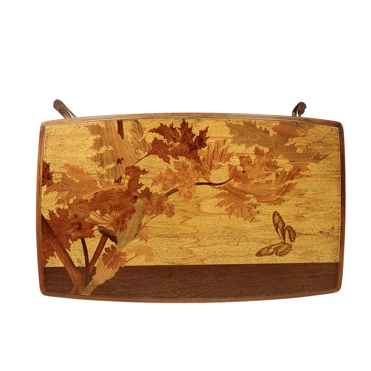 Design sofisticato e di singolare fascino, questo spettacolare scrittoio è una celebrazione dello stile Liberty francese (1880-1915). Riproduzione meticolosa di un disegno originale di Emile Gallè, presenta uno stupendo intarsio realizzato a mano con una combinazione di legni esotici. Completo di un cassetto. Si prega di consultare il Concierge per ulteriori dettagli.