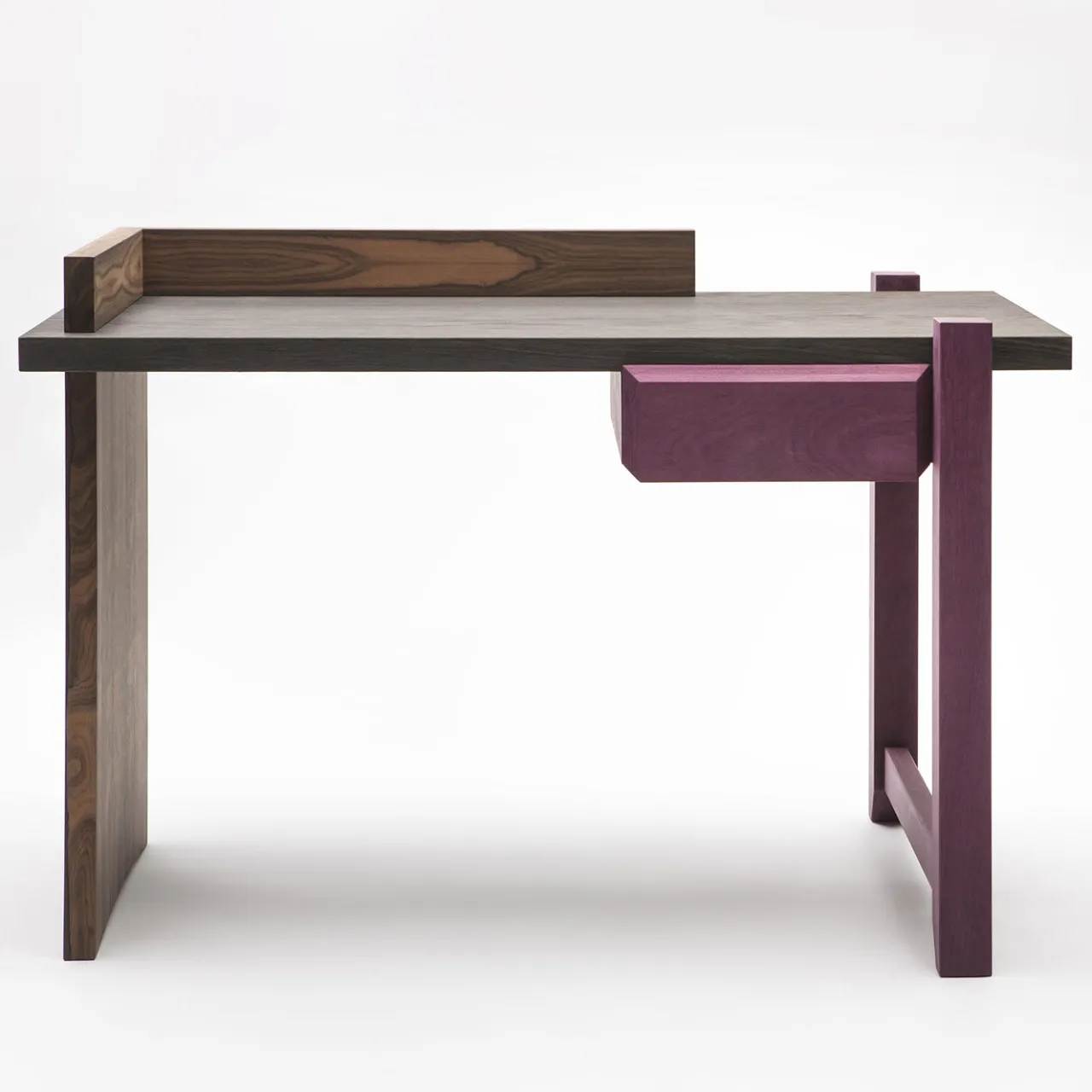 Squisita combinazione di sapiente artigianato tradizionale e materiali raffinati, questo scrittoio della serie Una Stanza è interamente realizzato in Ziricote, un legno esotico di grande impatto visivo, noto per le sue venature naturali a ragnatela e per le sue sfumature scure arricchite da toni violacei. Le parti della scrivania si intersecano elegantemente per creare un design unico, sostenuto da un pannello massiccio su un lato e da una gamba aperta sull’altro.