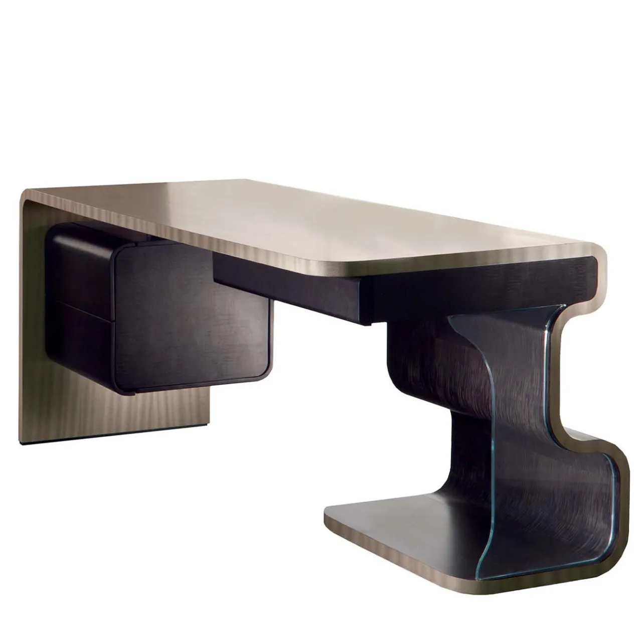 Questa scrivania scultorea è un sublime pezzo multifunzionale che combina linee rette e curve intriganti in un design che sarà il punto focale di uno studio moderno o di un ufficio elegante. Il piano in legno di pama si piega lungo una curva regolare per creare una delle gambe, mentre l’altra gamba è un’onda in sicomoro scuro che racchiude un cassetto. Il piano sotto il lato opposto è dotato di ulteriori cassetti portaoggetti nello stesso sicomoro scuro.