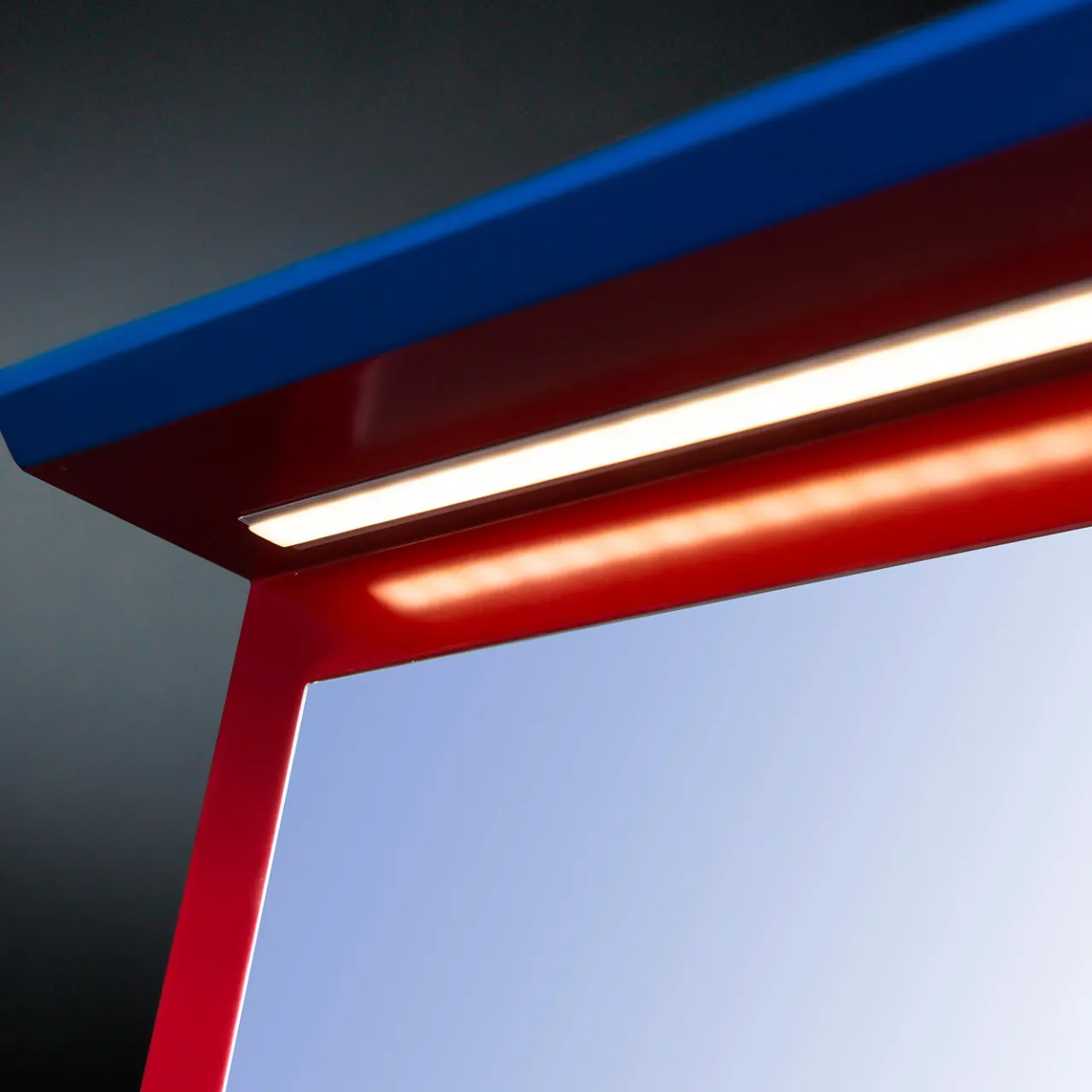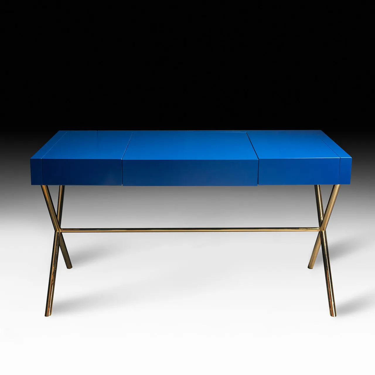 Questo raffinato scrittoio, con la sua lussuosa eleganza, valorizzerà qualsiasi arredamento. Questo scrittoio può essere utilizzato in uno studio o come parte di un ingresso ed è dotato di un piano apribile. Ha un piano centrale apribile con uno specchio montato all’interno e una luce LED. Presenta inoltre due cassetti interni scorrevoli laccati rossi, mentre all’esterno è laccato blu opaco e la base è in metallo zincato con finitura oro 24k.