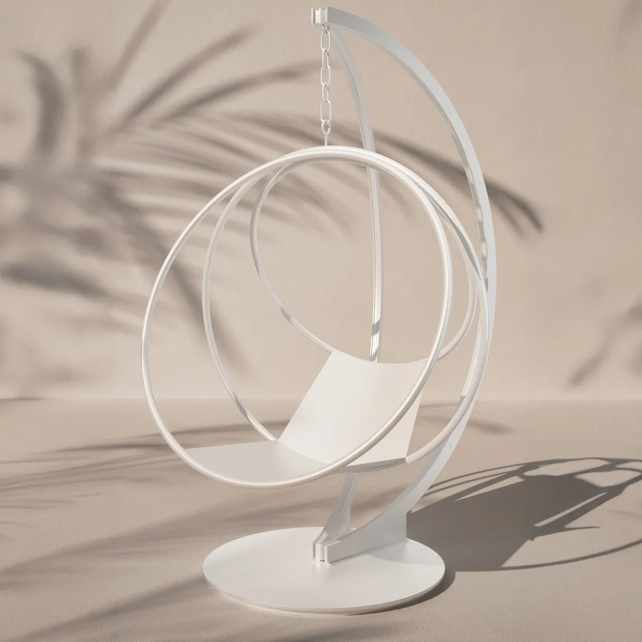 Sedia a dondolo sospesa in acciaio bianco Clara progettata per uso esterno, con struttura in acciaio verniciato a polvere per durata e resistenza alle condizioni atmosferiche. La sedia è sospesa da un supporto arcuato, che consente un delicato movimento di dondolio. Include cuscini morbidi per un maggiore comfort, progettati per migliorare il relax in qualsiasi ambiente esterno. La sua estetica moderna e minimalista unisce uno stile contemporaneo a un design funzionale, rendendola adatta per patio, giardini o terrazze. Cuscini inclusi e disponibili in una gamma di tessuti e colori su richiesta, contattare il Concierge per ulteriori informazioni.