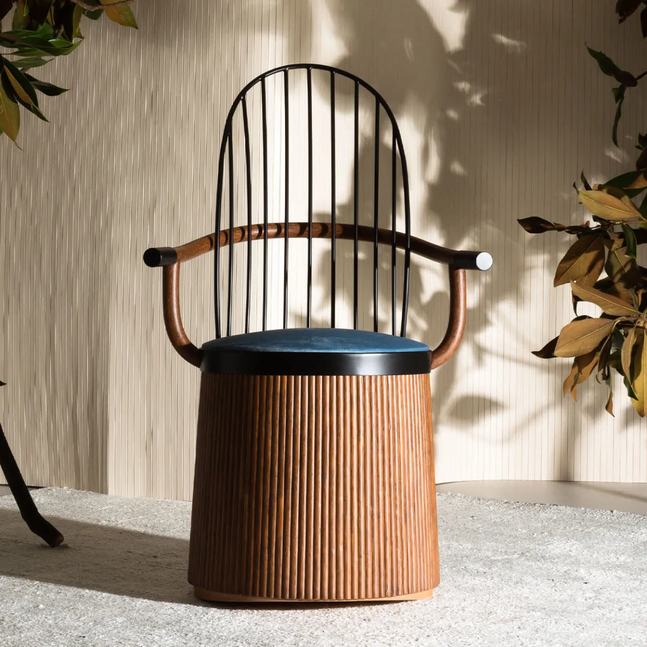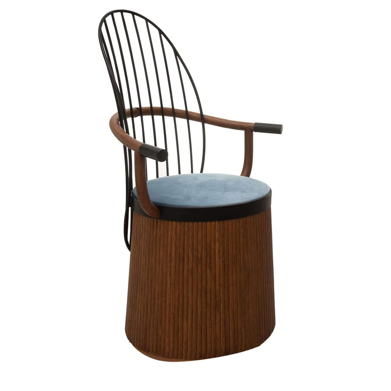 Dondolina è una sedia a dondolo disegnata da Antonio Aricò e realizzata da artigiani di Mogliano. La base in canna di rattan e i braccioli sono piegati a mano e laccati nel colore Terra, mentre lo schienale e i pomelli sono in metallo Nero Ardesia, anch’essi realizzati a mano. Il cuscino della seduta è rivestito in velluto Acquamarina. Ispirata ai paesaggi mediterranei, Dondolina offre calore e relax. Sono disponibili finiture e cuscini personalizzati. Si prega di consultare il concierge per i dettagli.