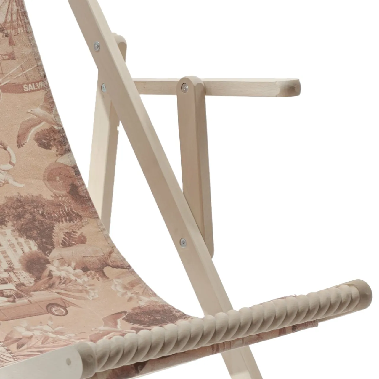 Una sedia a sdraio pieghevole in faggio massiccio si distingue per l’intarsio di fregi e modanature in legno tornito. Lo schienale è regolabile in quattro posizioni. Tessuto in cotone stampato con grafica Rimini, comprensivo di cuciture e asole per l’inserimento dei bastoni di fissaggio in legno. Il faggio naturale grezzo non trattato invecchierà come le altre materie prime.
