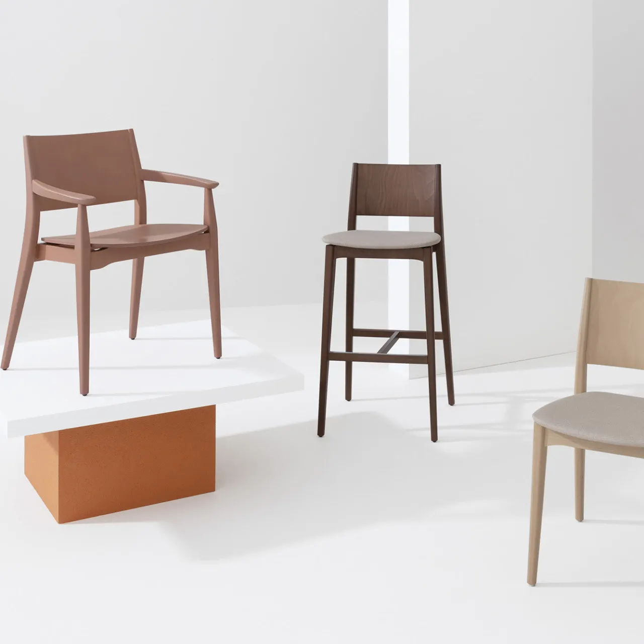 Questa raffinata sedia è il risultato di una collaborazione di successo con il designer Emilio Nanni. La robusta struttura è realizzata in faggio color salmone e sfoggia una silhouette rigorosa che comprende gambe affusolate, schienale rettangolare aperto, braccioli dritti e un sedile liscio (altezza 62 cm) leggermente inclinato all’indietro per offrire un ottimo comfort.