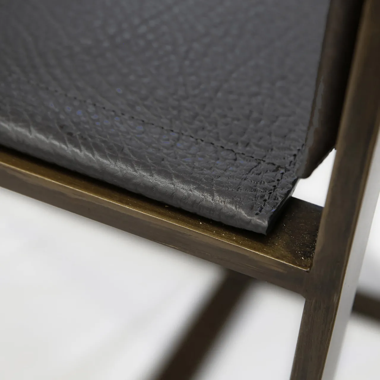 Sedia con struttura in metallo galvanizzato con effetto ottone brunito. La pelle della seduta e dello schienale ha una finitura testurizzata che ne aumenta la resistenza ai graffi. Il rivestimento in pelle è rinforzato per garantire il mantenimento della forma nel tempo.