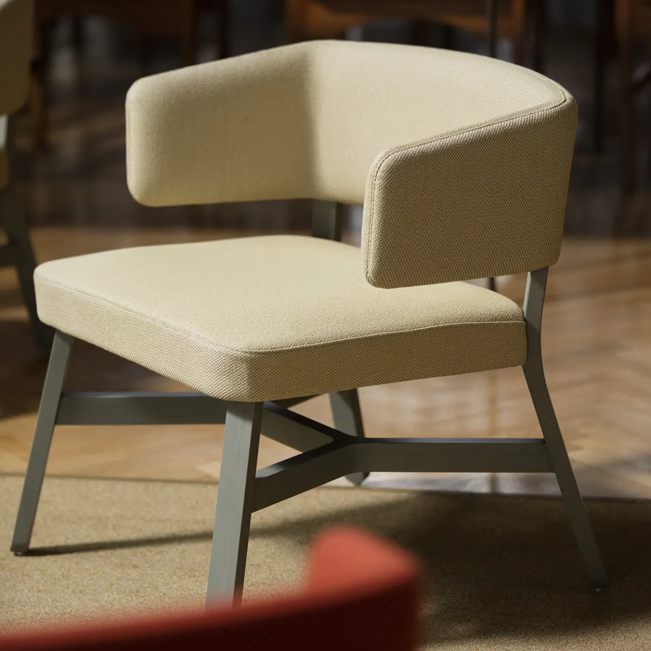 Questa sofisticata poltrona lounge in faggio massiccio invita a sedersi in compagnia di un buon libro. Tinta in grigio cemento, la struttura in legno è composta da gambe inclinate, collegate da un esclusivo disegno a incrocio, che sostengono uno schienale squadrato e avvolgente e un sedile largo e alto 44,5 cm, entrambi completamente rivestiti in pelle beige per offrire il massimo comfort. Certificazioni contract e commerciali disponibili su richiesta.