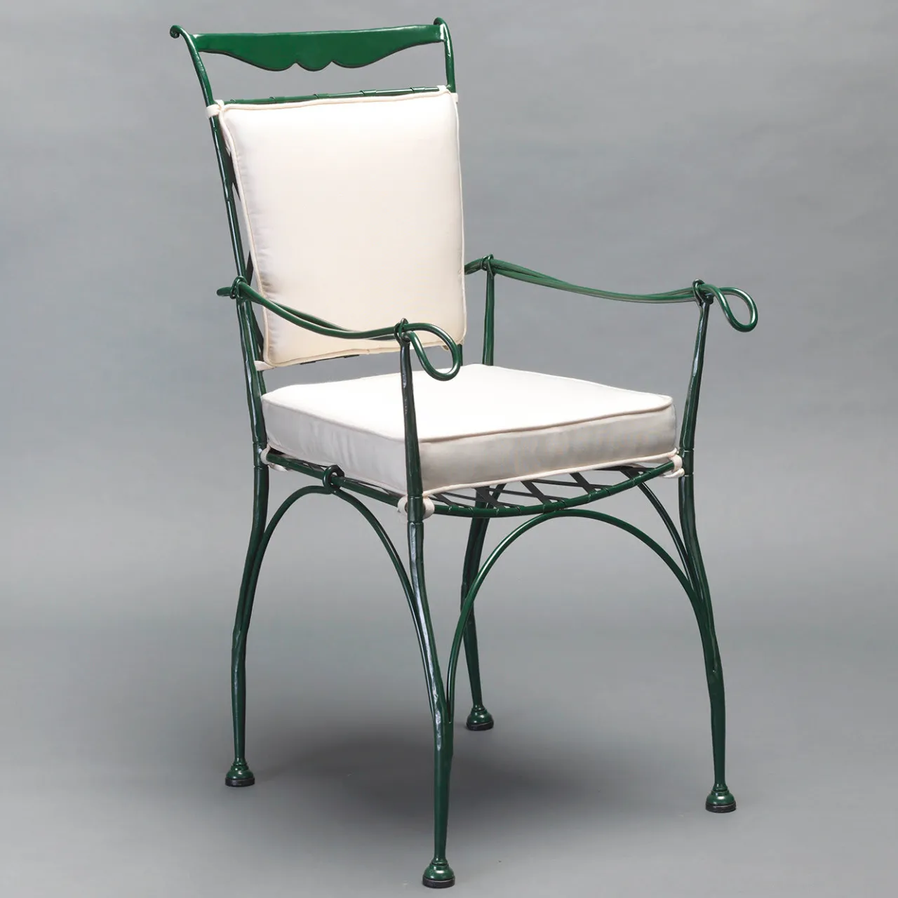 Il design suggestivo di questa magnifica sedia con braccioli prende vita grazie alla sapiente maestria degli artigiani di Officina Ciani, che hanno forgiato il ferro in forme morbide e silhouette delicate che evocano la consistenza della corda. I volumi di ispirazione tradizionale e l’andamento squadrato di seduta e schienale sono trattati con zinco e verniciati a polvere per rendere questa sedia adatta all’uso esterno. Il cuscino, rivestito in tessuto per esterni, aggiunge comfort a questo affascinante pezzo che sarà una splendida aggiunta a una terrazza o a un patio.