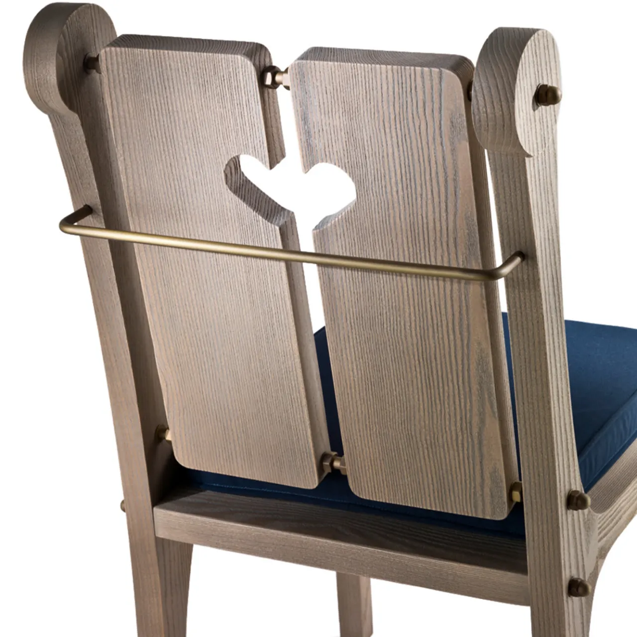 Richiamando il tradizionale stile alpino, questa sedia sarà un’elegante aggiunta all’arredamento rustico-chic, a uno chalet di montagna o a un ambiente eclettico interno o esterno. Realizzata a mano in sassofrasso americano, è caratterizzata da un design pulito di influenza nordica, in particolare dalla decorazione a forma di cuore che caratterizza lo schienale. Caratterizzato da tonalità chiare e naturali del legno, è arricchito da dettagli in metallo bronzato e ottone. Un cuscino rivestito in tessuto blu è sostenuto da un’asta metallica posteriore. Adatto anche per l’esterno.