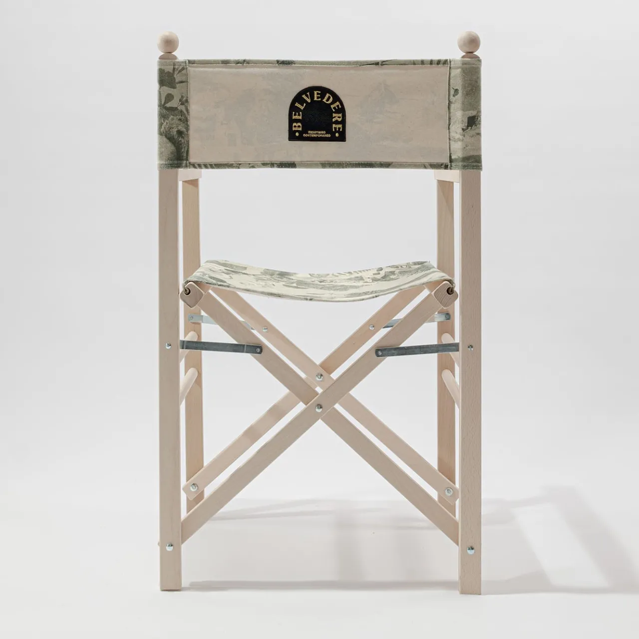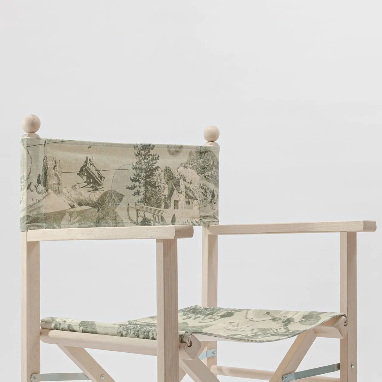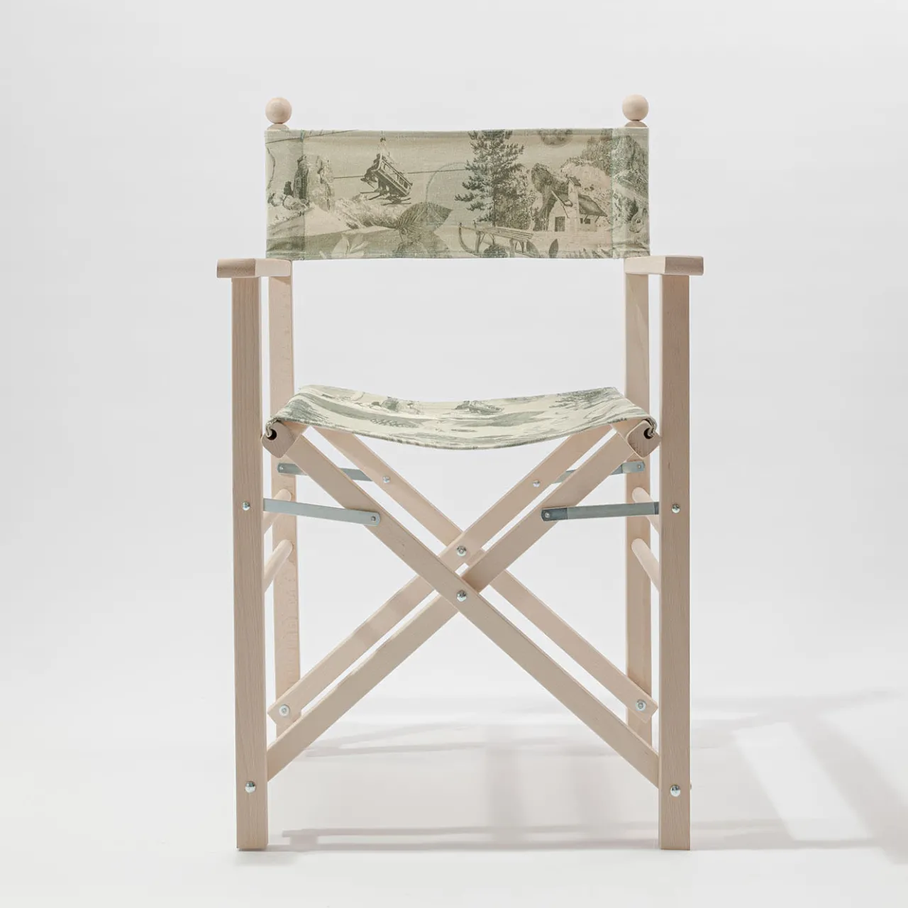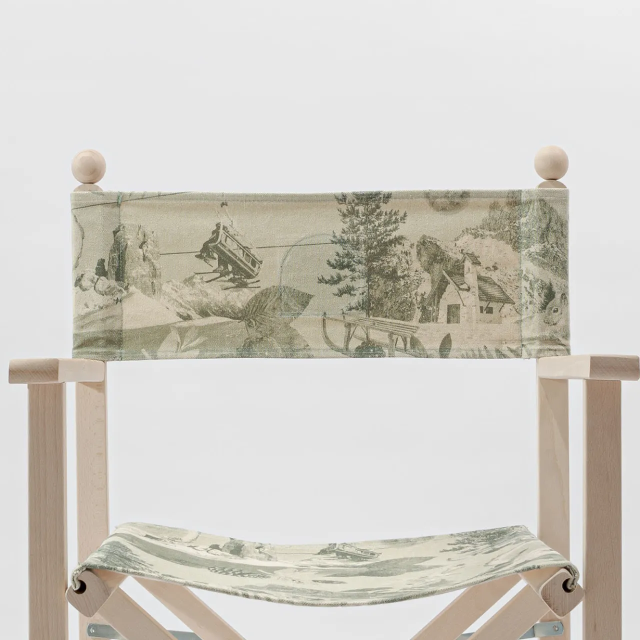 Sedia da regista pieghevole in faggio massiccio caratterizzata dall’inserimento di fregi e modanature in legno tornito. Tessuto in cotone stampato con grafica Cortina-Dolomites comprensivo di cuciture e asole per l’inserimento delle bacchette di fissaggio in legno.