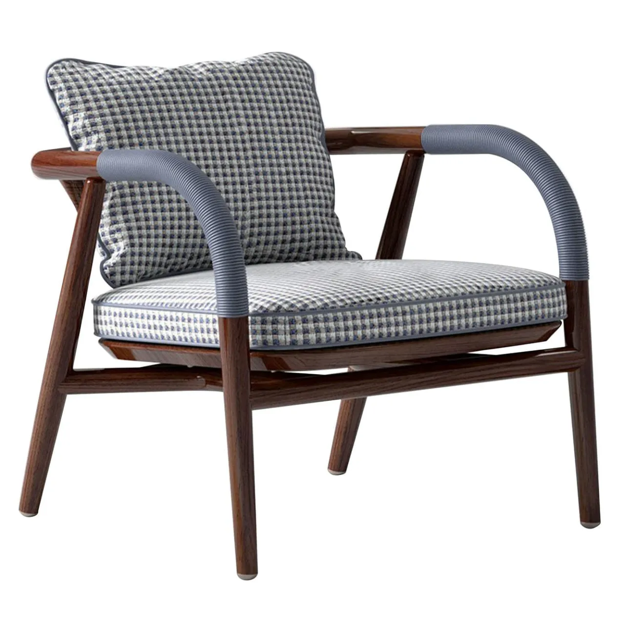Poltrona con tessuto all-in. Profili in pelle. Struttura in mogano Sapeli lucido. Dettagli metallici in acciaio spazzolato.