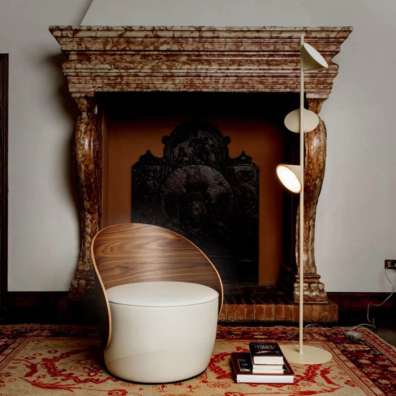 Sistemata accanto al camino o a complemento di una sala d’attesa, questa poltrona colpisce per il suo design moderno e caldo. La struttura in metallo verniciato nero è abbinata a un sedile circolare imbottito in poliuretano ignifugo iniettato a freddo e rivestito in pregiata pelle beige (CLASS RP®). L’avvolgente schienale in legno con finitura noce e profili inclinati incorpora i braccioli.
