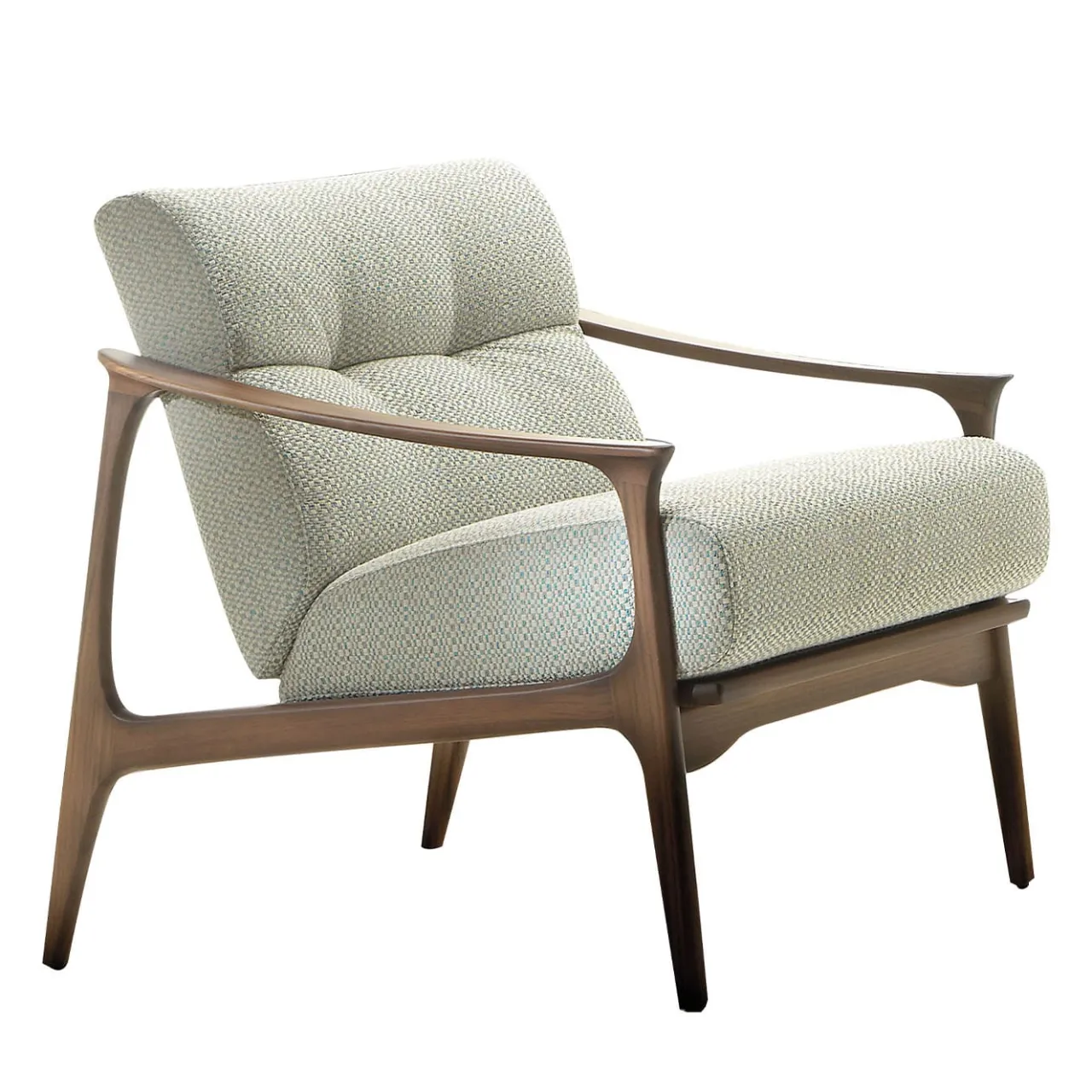 Linee slanciate e fitomorfe tracciano la silhouette ariosa del faggio secco che caratterizza questa poltrona da salotto di ispirazione Art Déco. Con una calda finitura in noce, il design assicura un comfort duraturo grazie alla seduta e allo schienale generosamente imbottiti, entrambi avvolti da un fresco rivestimento in lino proposto in una delicata combinazione di toni beige e azzurri. Il tavolino Ostuni, disponibile nel catalogo Artemest, è un abbinamento perfetto.