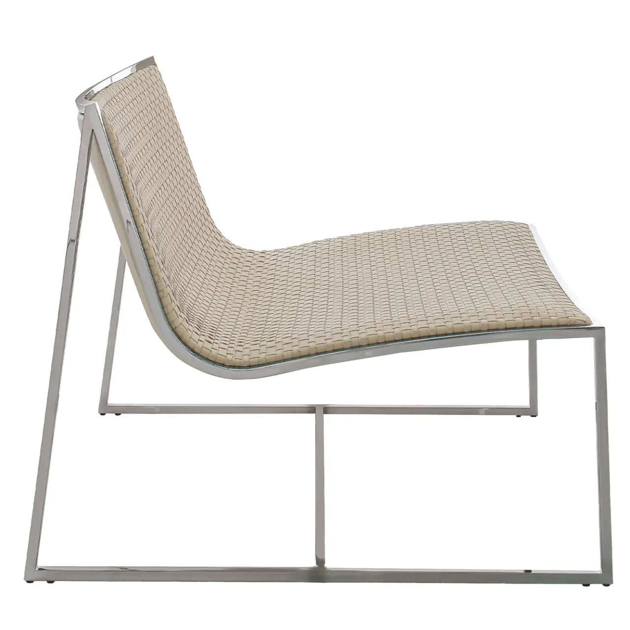 Una silhouette ariosa definita da ordinati profili geometrici e impreziosita da una scintillante finitura cromata caratterizza questa poltrona lounge come un gioiello dell’arredamento contemporaneo. La schiuma poliuretanica flessibile vulcanizzata a freddo assicura un’esperienza di seduta davvero confortevole, che si arricchisce di lusso sartoriale grazie alla pelle intrecciata di colore bianco sporco che sigilla la scocca curva. Contattare il Concierge per le varianti di finitura disponibili e per la versione ignifuga.