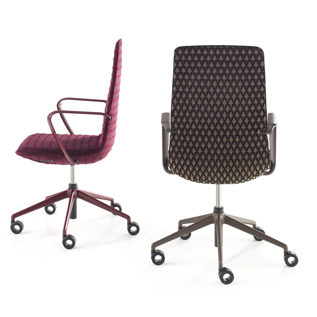 La poltrona imbottita L-Air presenta un meccanismo di inclinazione sincronizzata attivato dal peso con uno schienale di 18° e un’angolazione della seduta di 1°. L’inclinazione dello schienale può essere bloccata in qualsiasi posizione utilizzando una leva attivata da cavo, che controlla anche la regolazione dell’altezza. La sedia include braccioli e base in alluminio verniciato, con ruote nere da 65 mm progettate per un movimento fluido. Rivestita in tessuto Dedar, combina funzionalità ergonomica con uno stile moderno per l’ufficio.