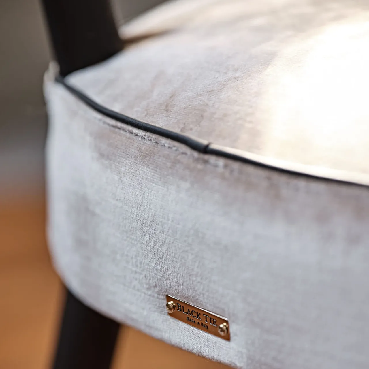 Esclusivi dettagli sartoriali e una generosa imbottitura conferiscono a questa sedia in faggio tinto moka un fascino sofisticato. Perfetta per gustare i pasti senza rinunciare al comfort, l’imbottitura interna in poliuretano espanso è rivestita in morbido tessuto bianco (non rimovibile), impreziosita da un disegno a canali lungo la parte anteriore dello schienale e arricchita da dettagli in piping a contrasto. Il poggiapiedi a forma di X, rifinito in oro lucido, completa il design.
