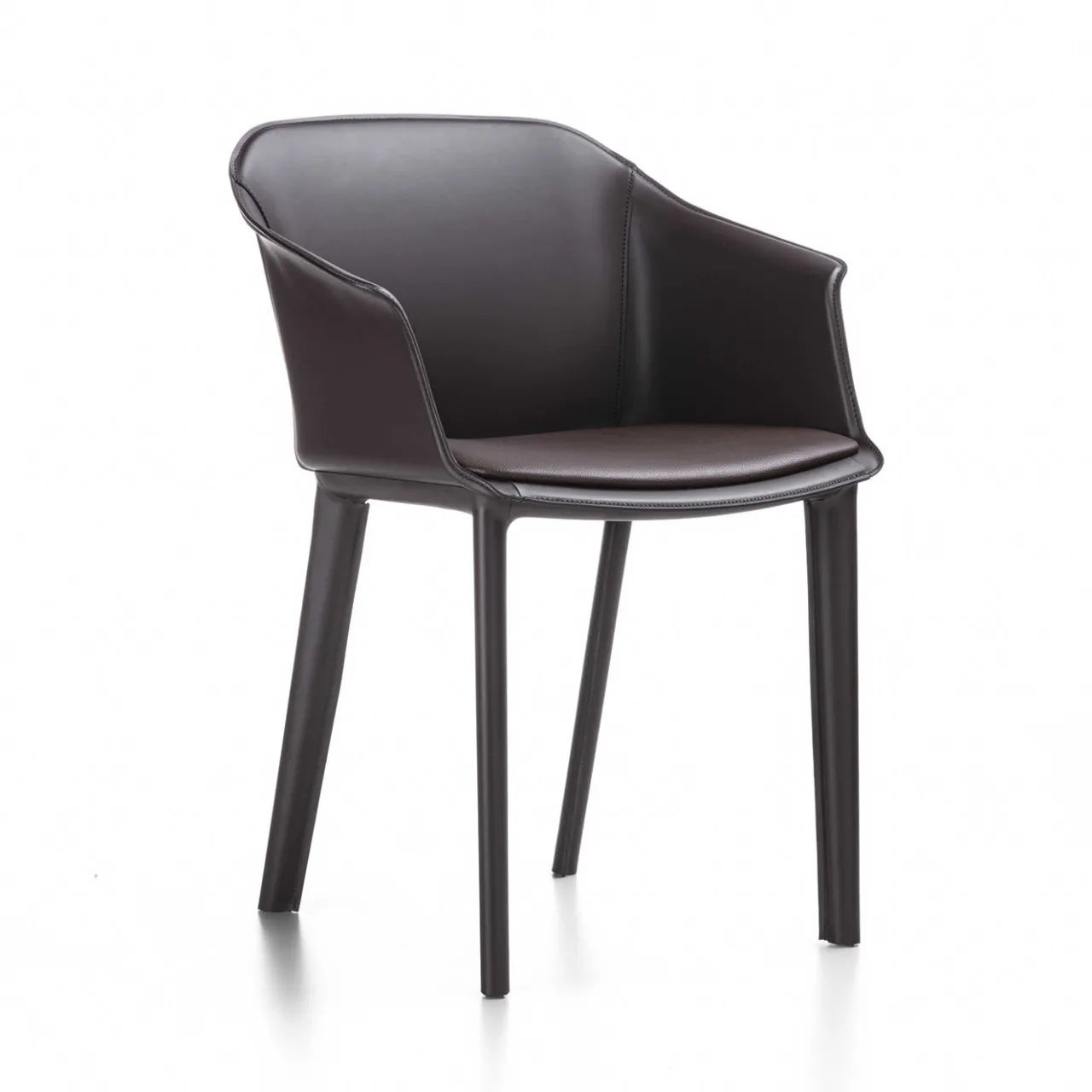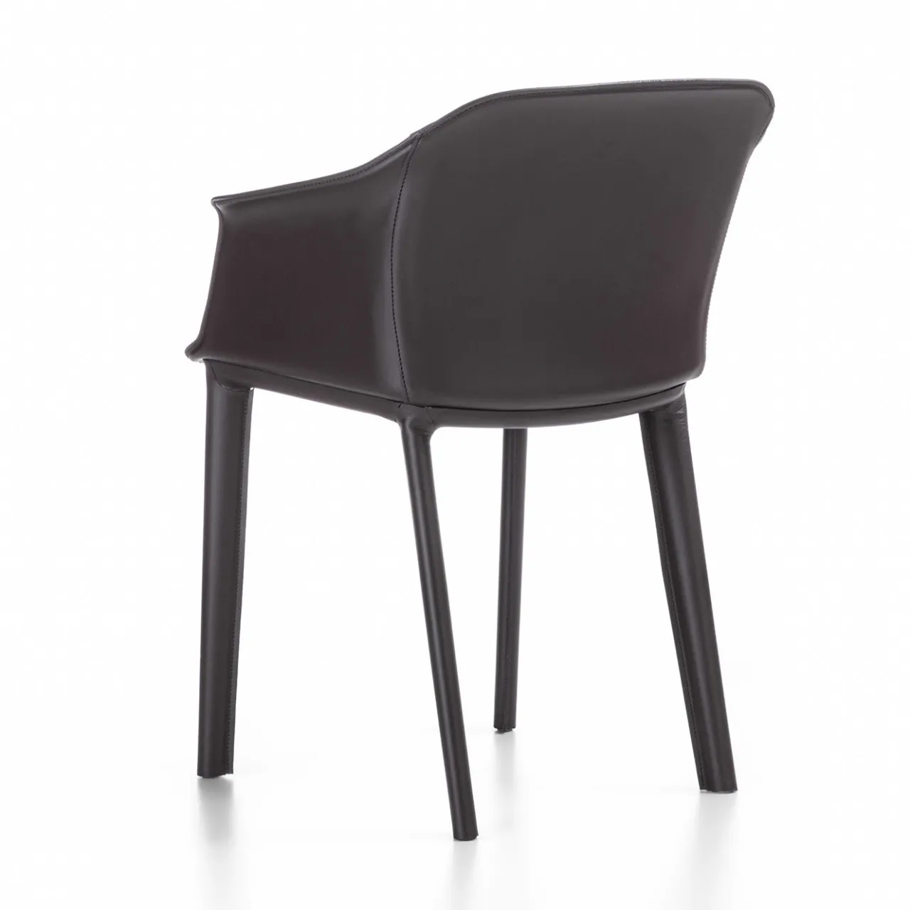 Poltrona con scocca in poliuretano rigido disponibile in pelle con sottile cuscino di seduta integrato, oppure imbottita e rivestita in morbida pelle, feltro, materiale innovativo o materiale fornito dal cliente. Struttura a 4 gambe, rivestite dello stesso materiale della scocca. Tutti i componenti sono disponibili in altri colori. Per maggiori informazioni, contattare il concierge.