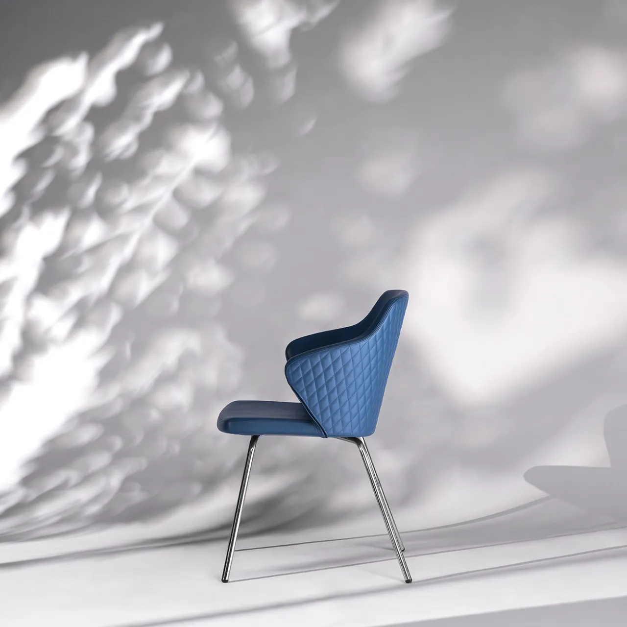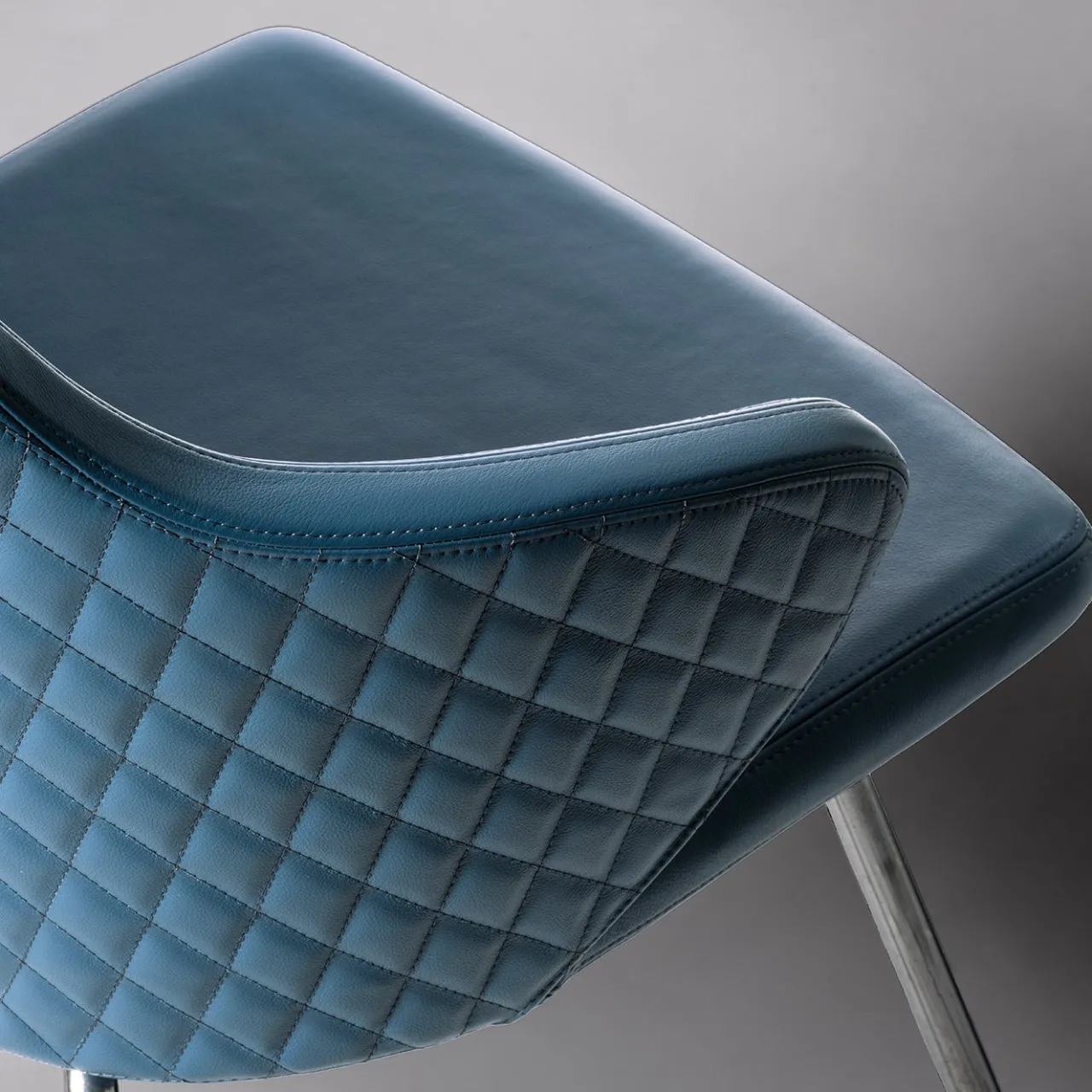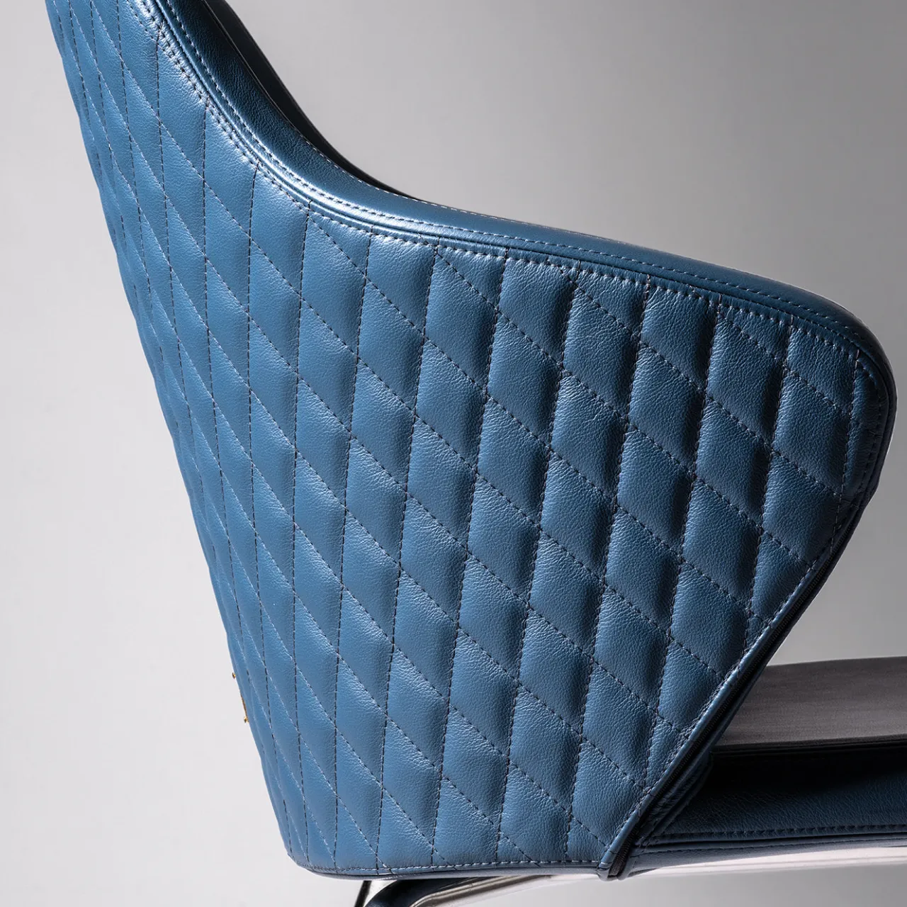 Una sedia con un design originale e contemporaneo, caratterizzata da una struttura in metallo slanciata ma robusta che combina leggerezza visiva e resistenza strutturale. Il sedile ergonomico e accogliente è rivestito in pelle blu di alta qualità con una finitura raffinata, mentre lo schienale imbottito a rombi aggiunge profondità visiva e dettagli artigianali. Un’imbottitura generosa assicura un comfort duraturo e le sue proporzioni compatte la rendono ideale per spazi abitativi sofisticati e contesti di lusso.
