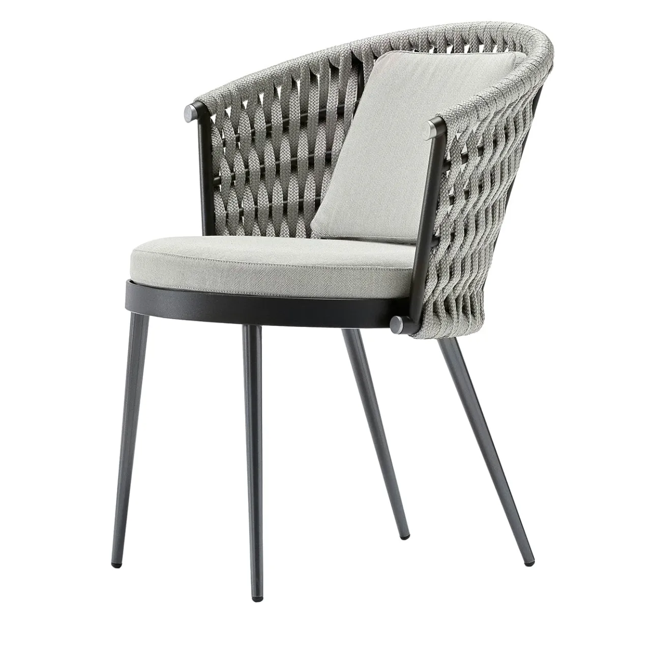 Questa sedia da esterno è dotata di gambe e struttura in metallo nero satinato trattato in cataforesi. La seduta dello schienale è in cordame intrecciato grigio chiaro ed è dotata di cuscino lombare. Speciale copertura per esterni inclusa nel prezzo. Design di Castello Lagravinese Studio.